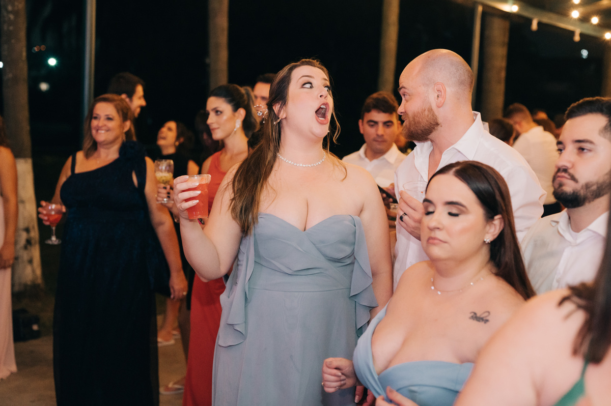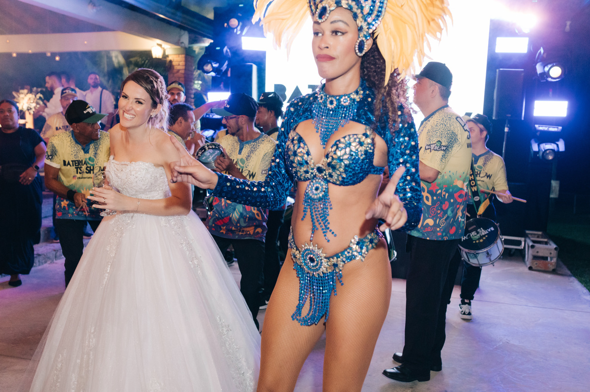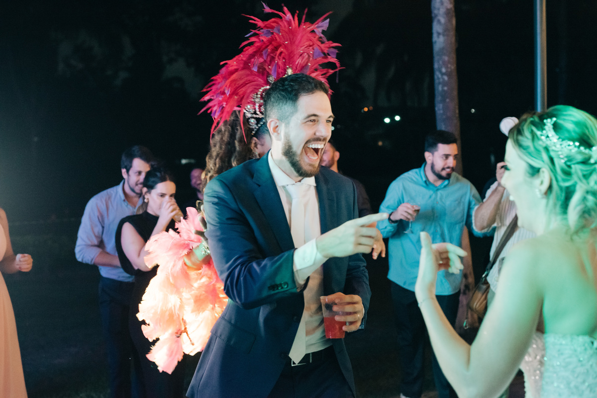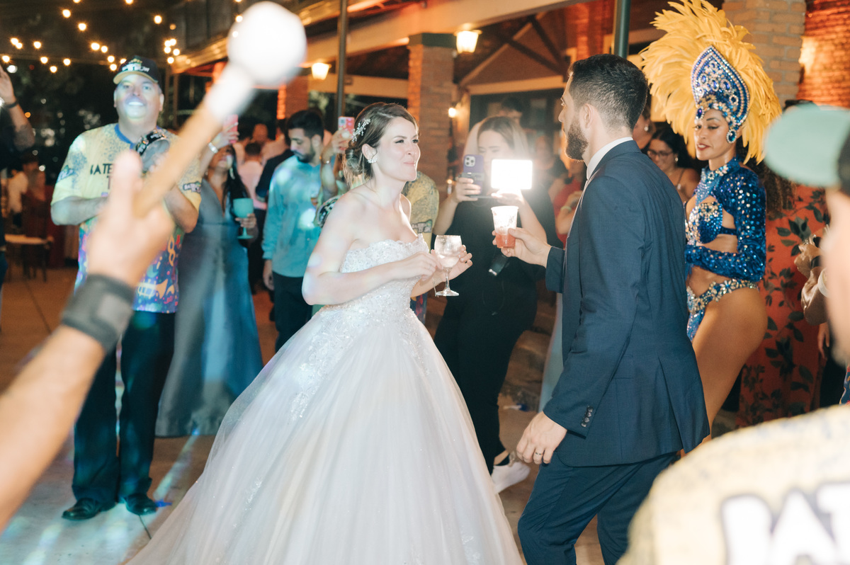 Após a cerimônia, dirigimo-nos ao Golf Clube de Santos, onde a festa começou em grande estilo. O ambiente luxuoso e os jardins bem cuidados proporcionaram o cenário ideal para uma celebração animada. Com música ao vivo que variava do sertanejo aos ritmos contagiantes da escola de samba, os convidados dançaram a noite toda, criando memórias que durarão para sempre.