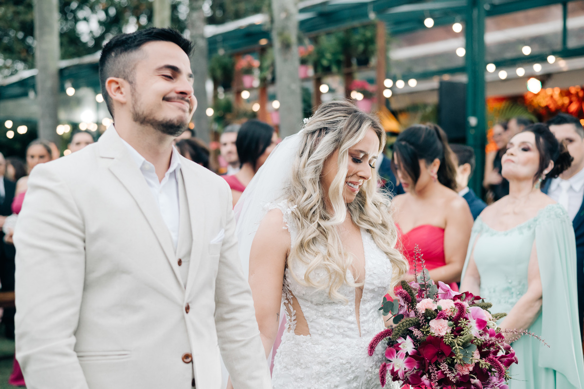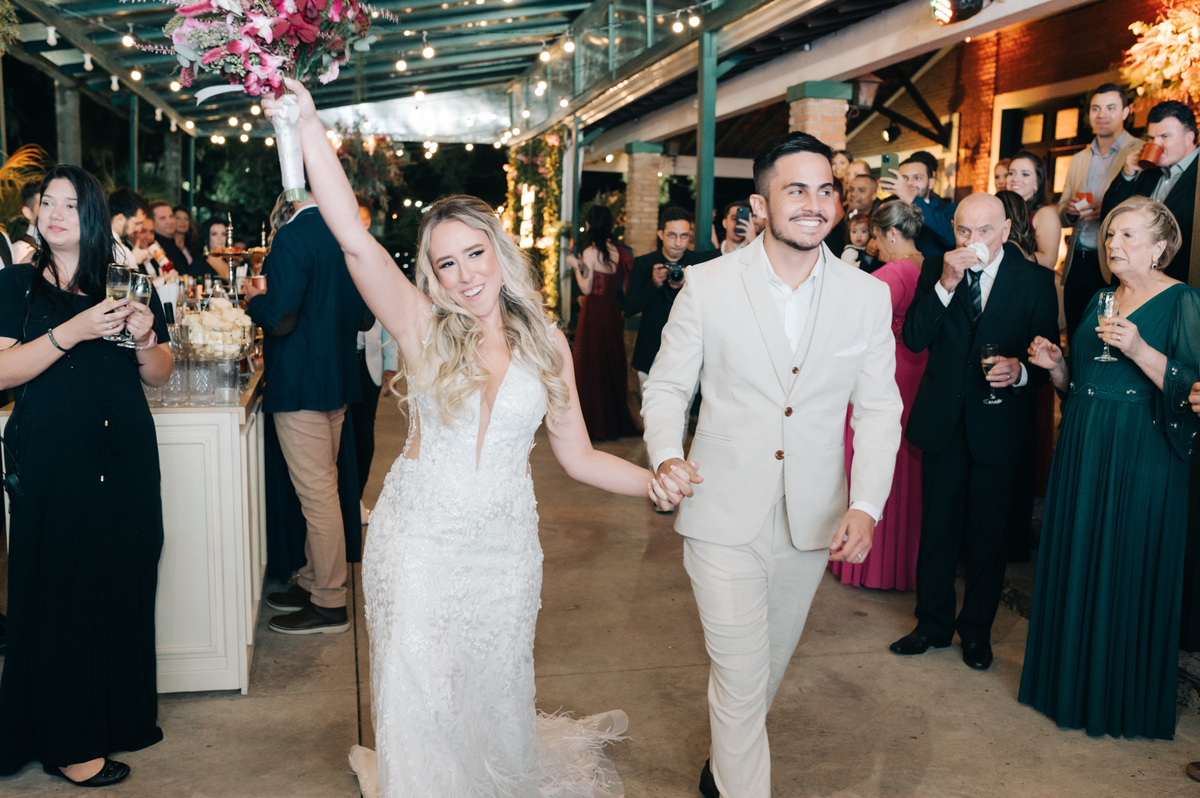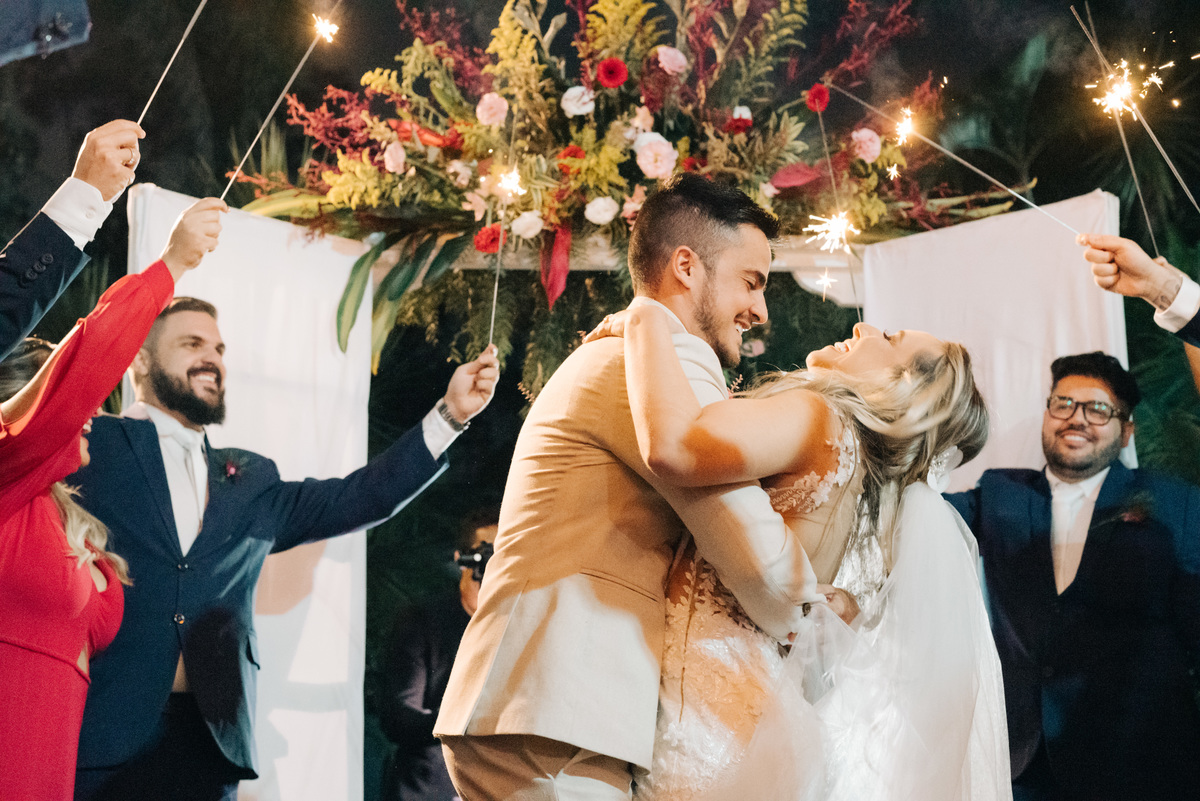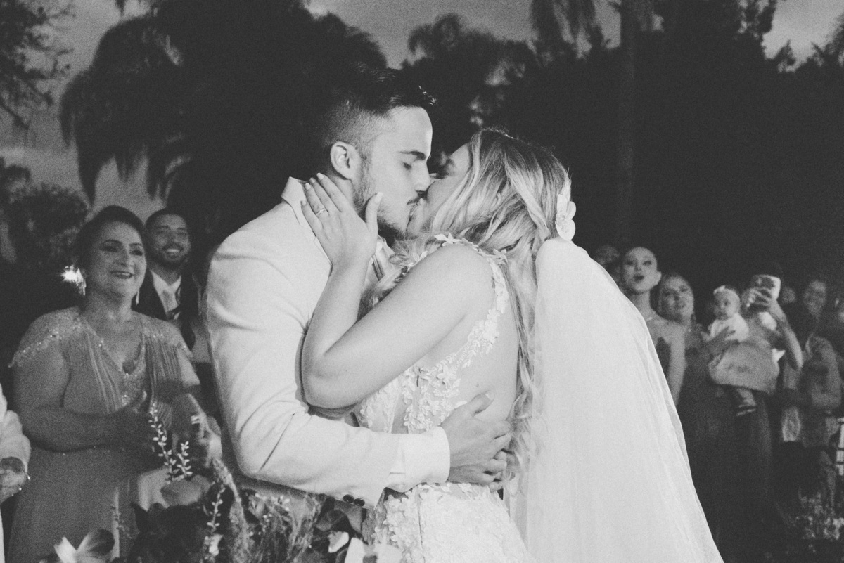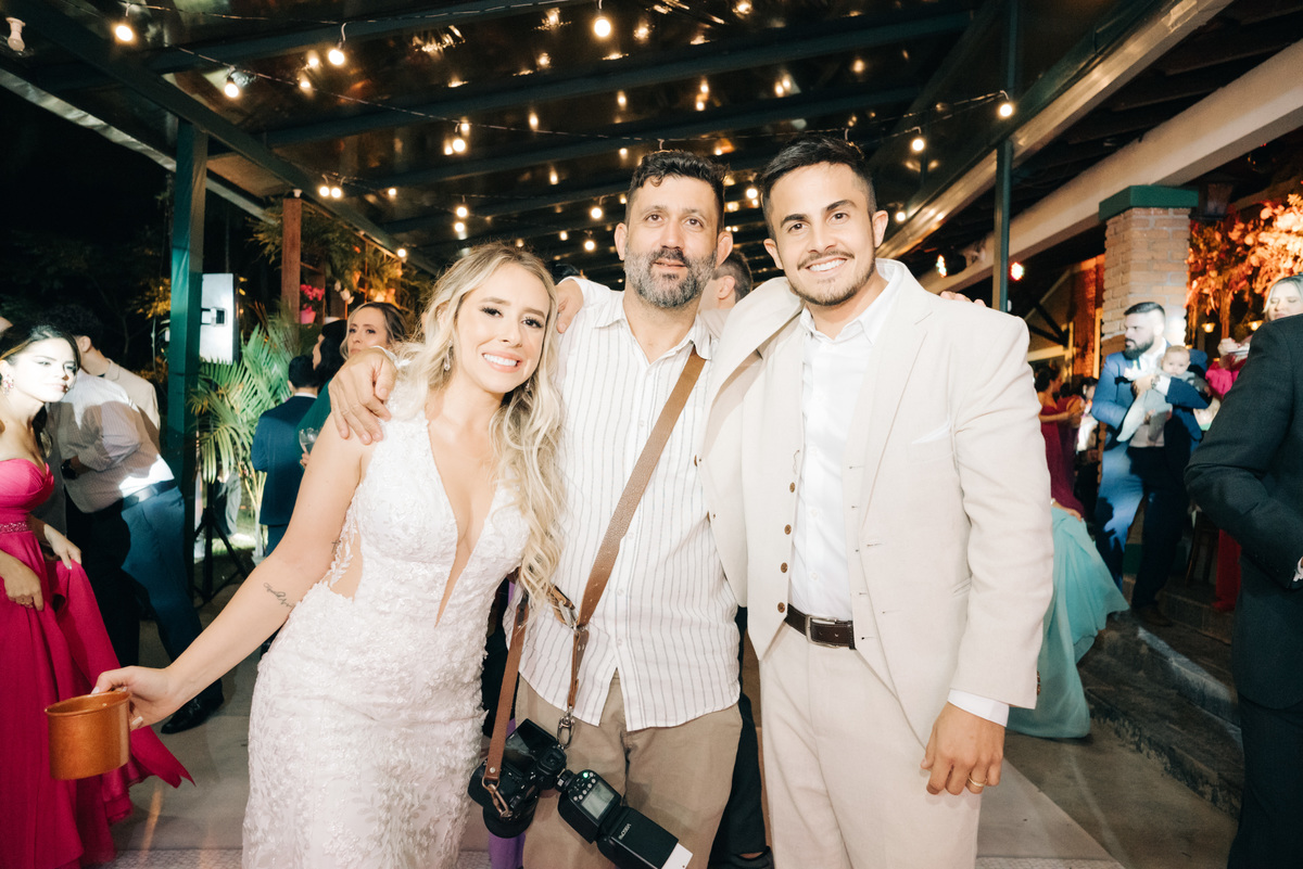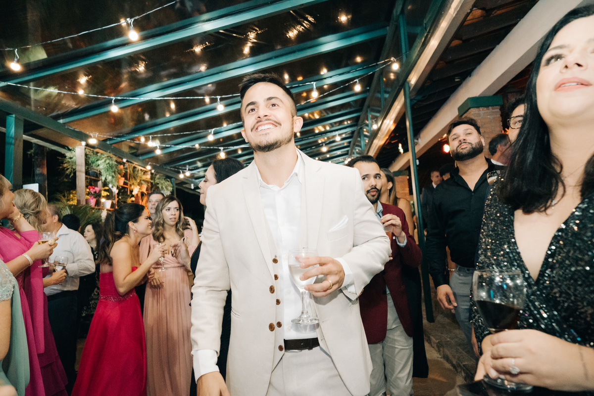 À medida que a cerimônia avançava e o dia se transformava em noite, o local ganhava uma nova atmosfera. Luzes suaves foram acesas, criando um ambiente acolhedor e íntimo para a festa que estava por vir. A saída dos noivos, agora marido e mulher, ocorreu já ao anoitecer, sob um céu estrelado que parecia celebrar a união que tinha acabado de acontecer.