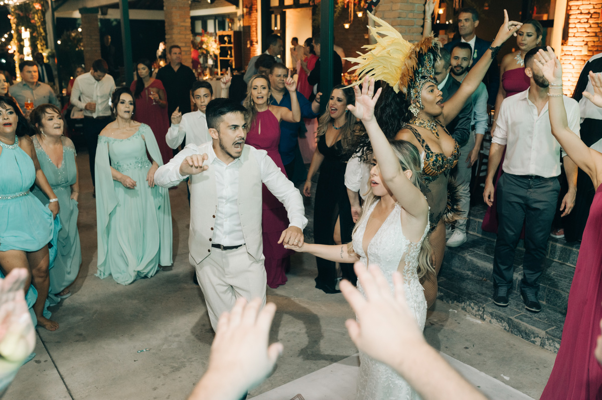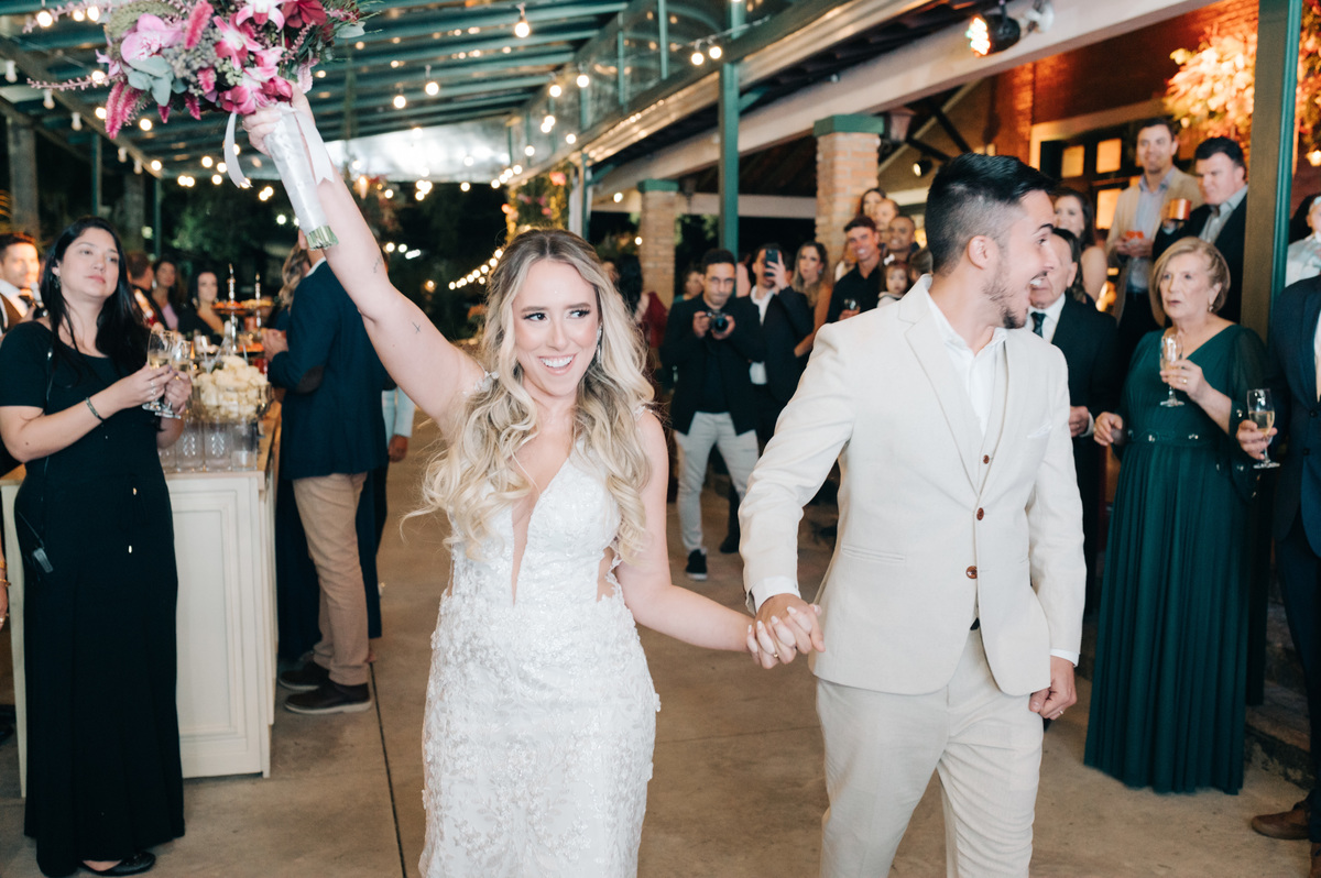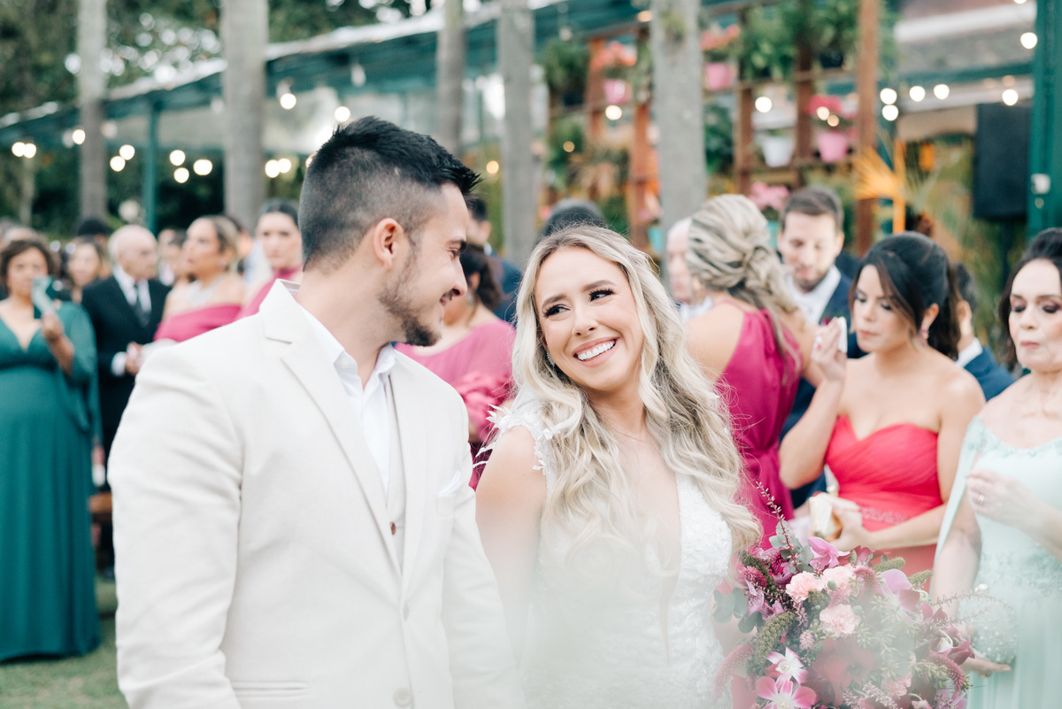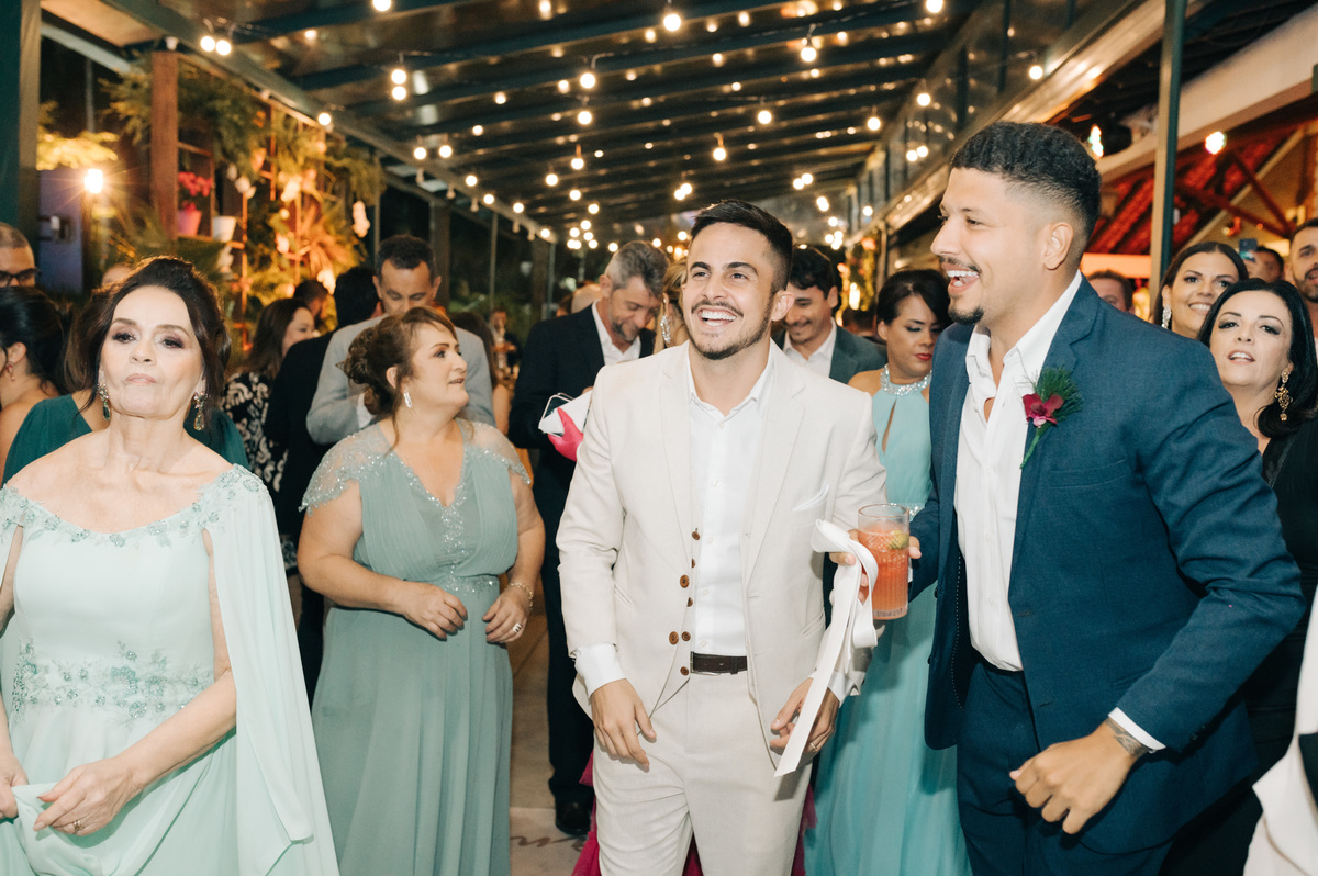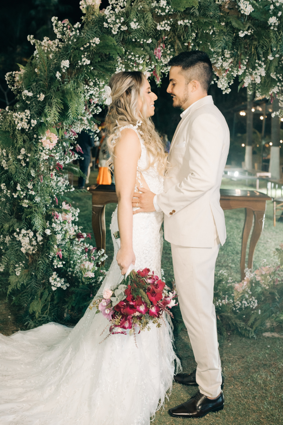 À medida que a cerimônia avançava e o dia se transformava em noite, o local ganhava uma nova atmosfera. Luzes suaves foram acesas, criando um ambiente acolhedor e íntimo para a festa que estava por vir. A saída dos noivos, agora marido e mulher, ocorreu já ao anoitecer, sob um céu estrelado que parecia celebrar a união que tinha acabado de acontecer.