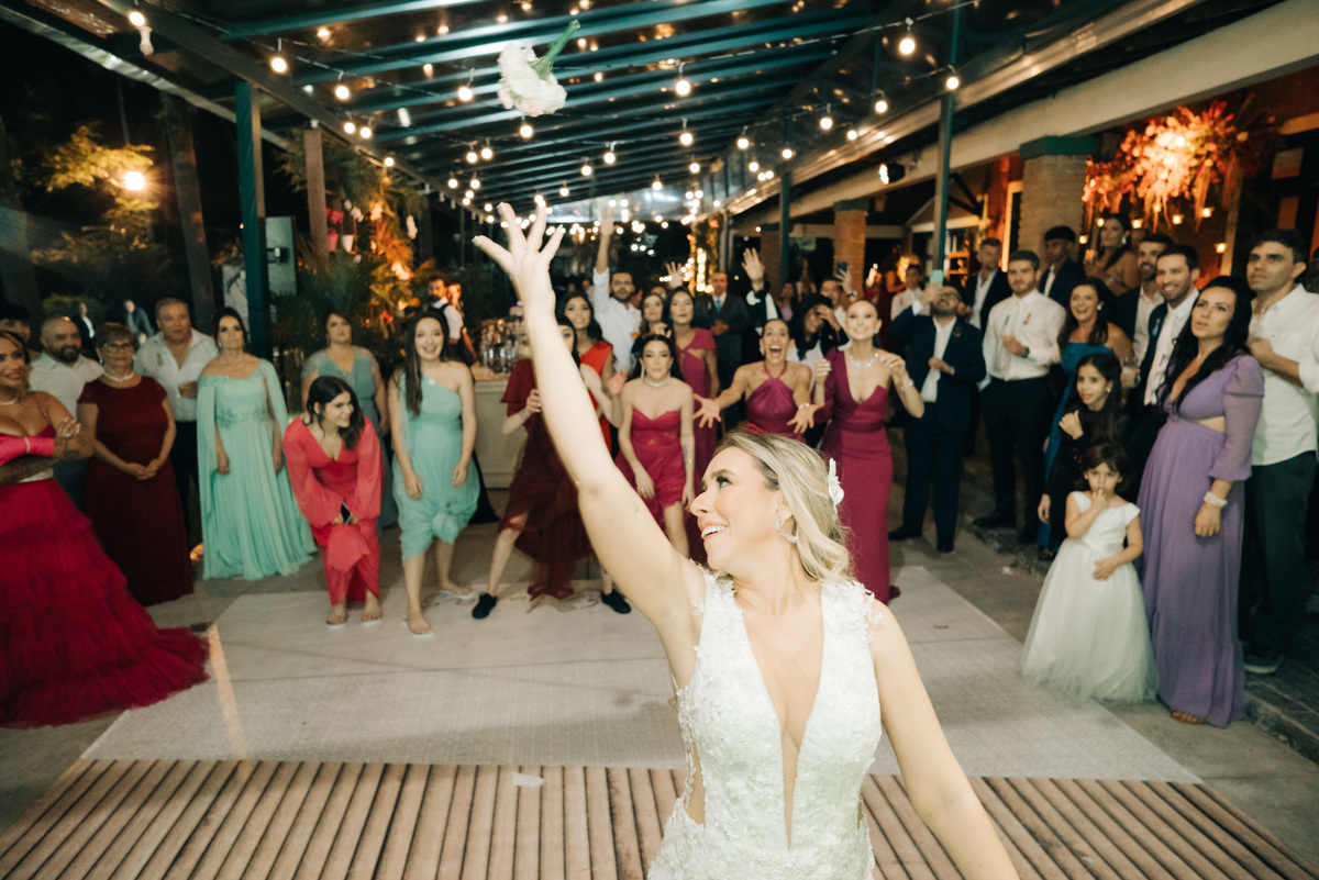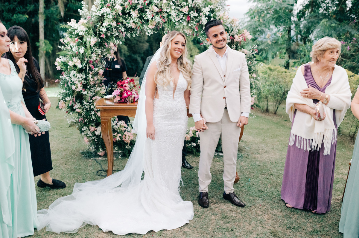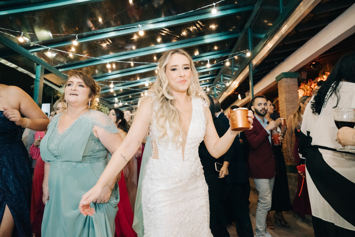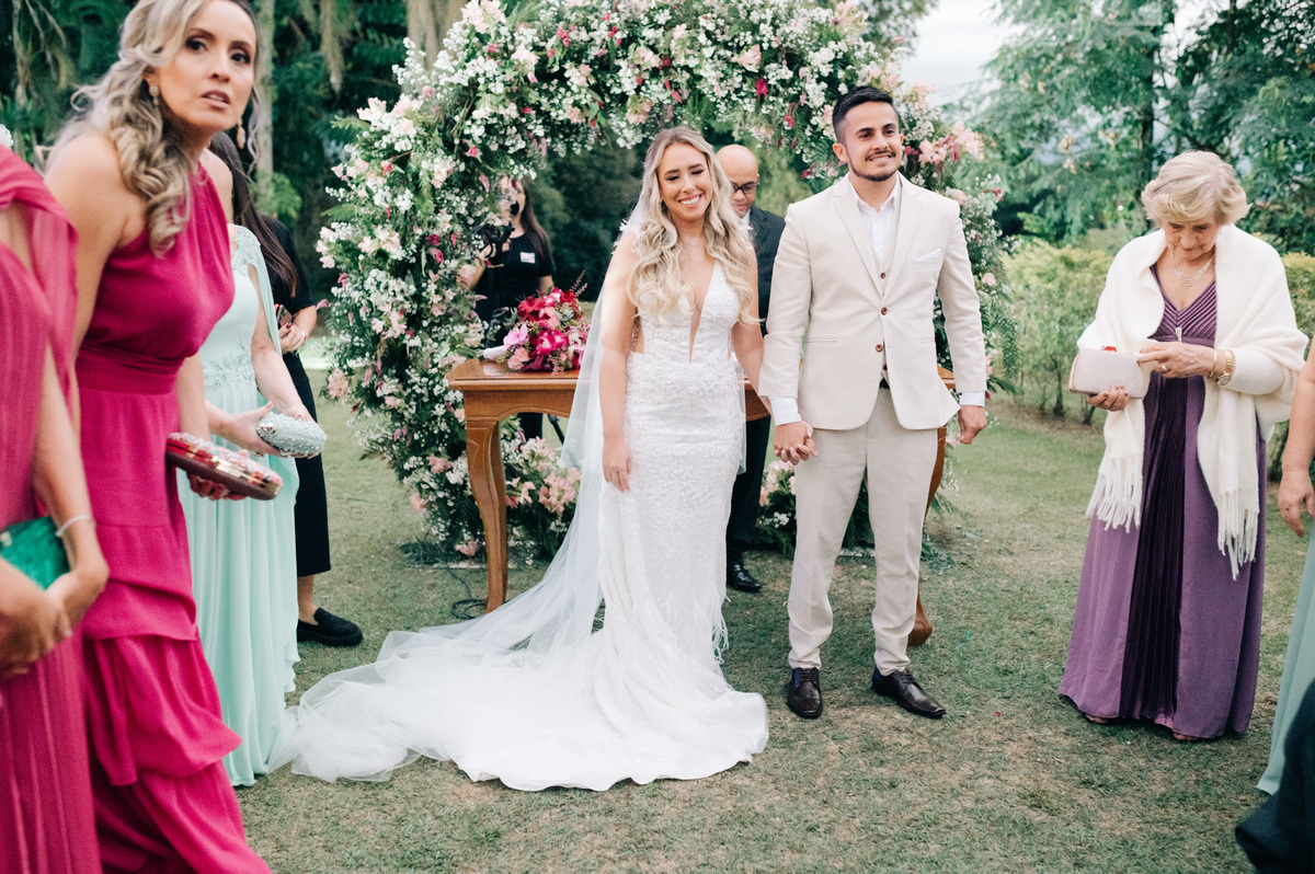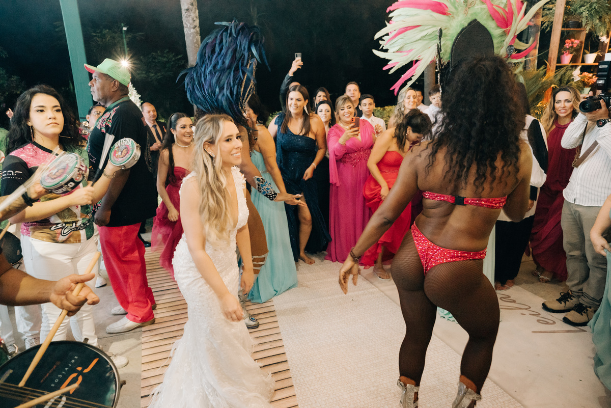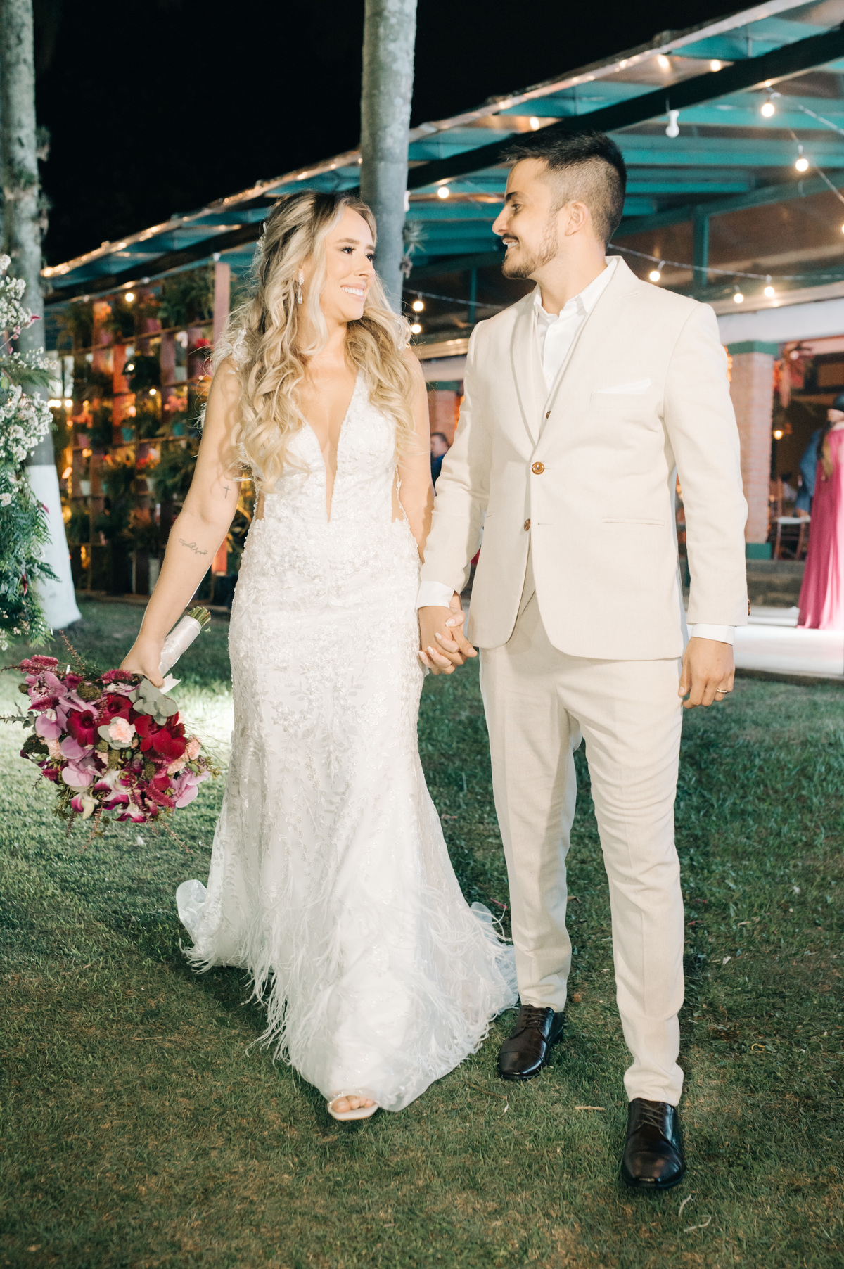À medida que a cerimônia avançava e o dia se transformava em noite, o local ganhava uma nova atmosfera. Luzes suaves foram acesas, criando um ambiente acolhedor e íntimo para a festa que estava por vir. A saída dos noivos, agora marido e mulher, ocorreu já ao anoitecer, sob um céu estrelado que parecia celebrar a união que tinha acabado de acontecer.