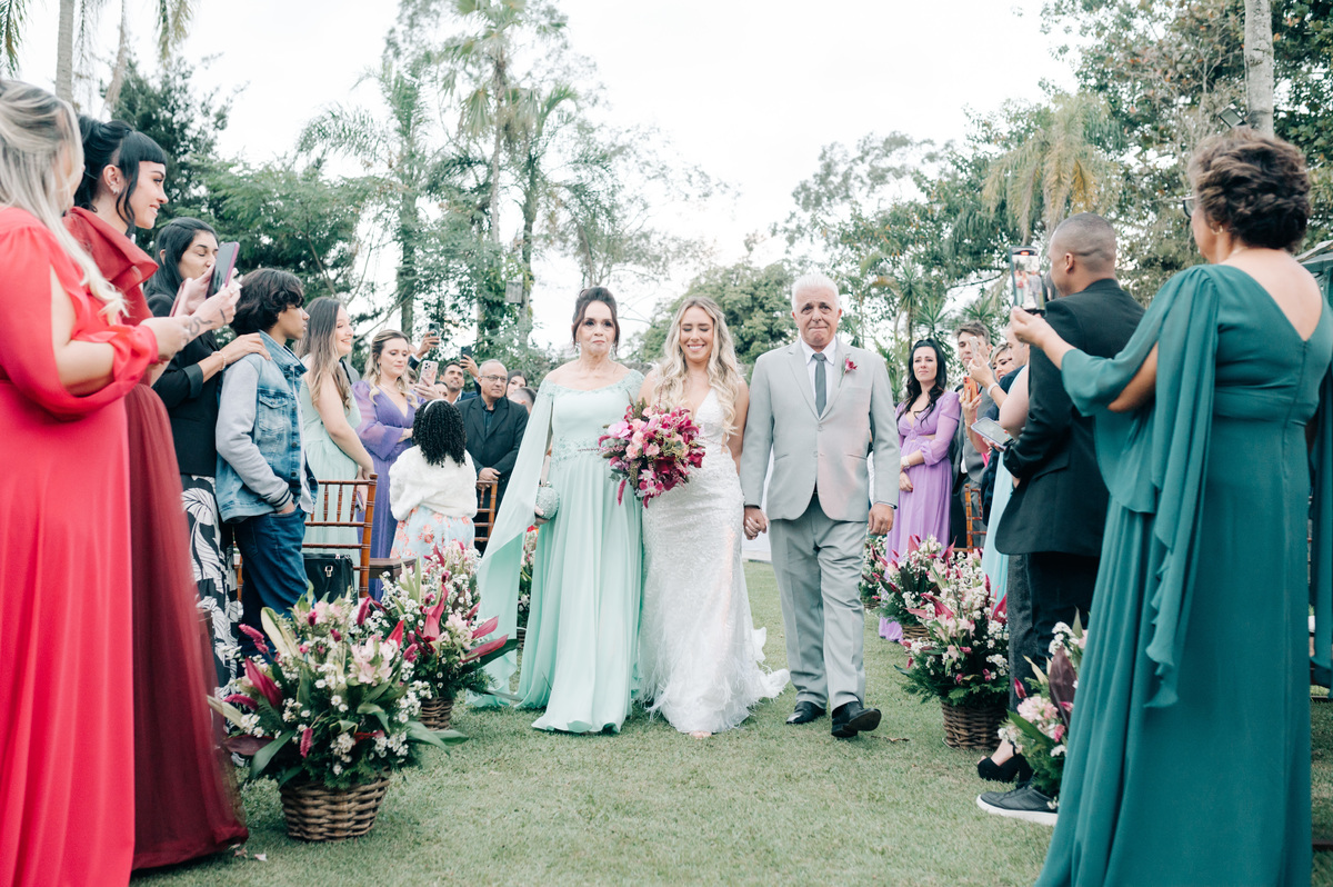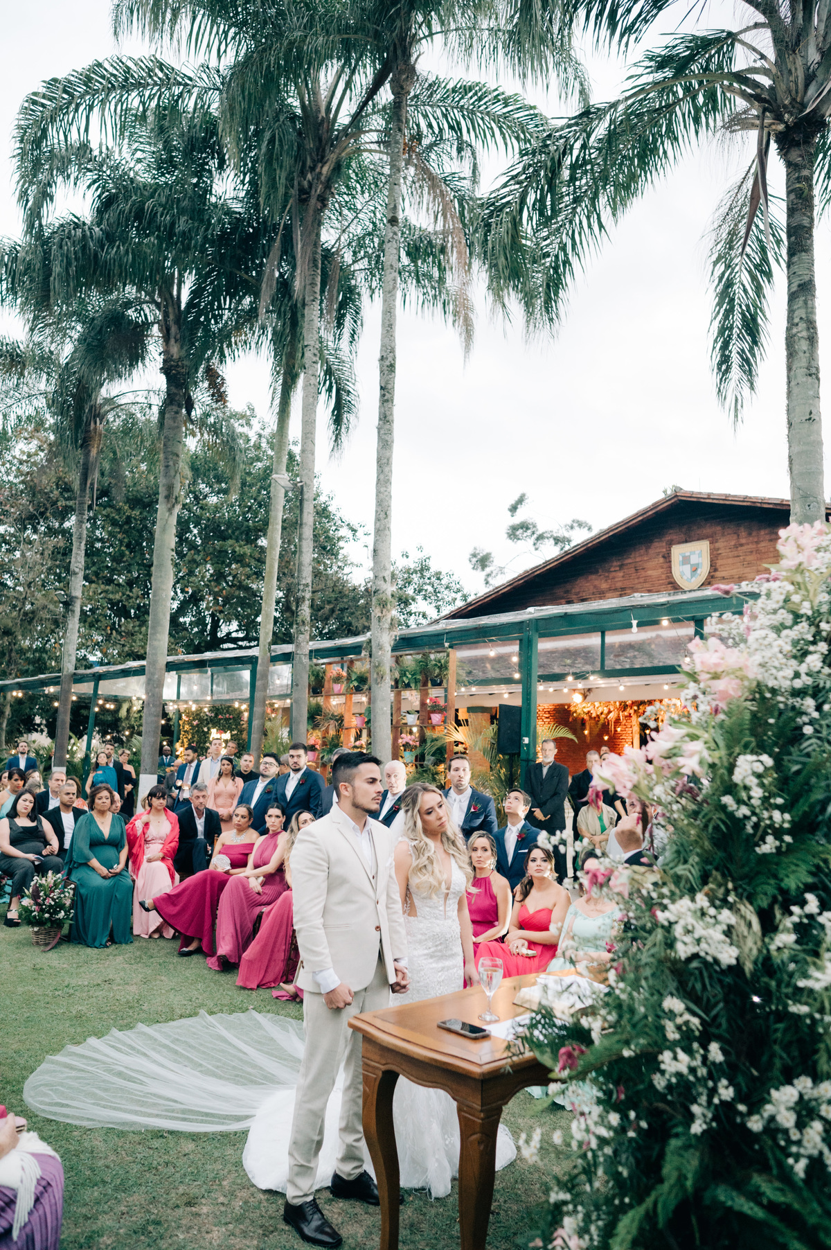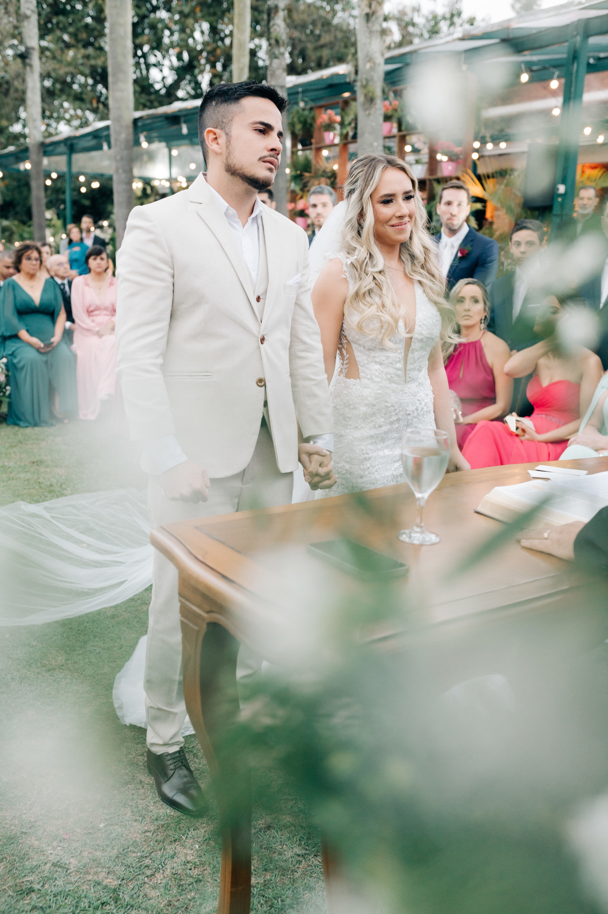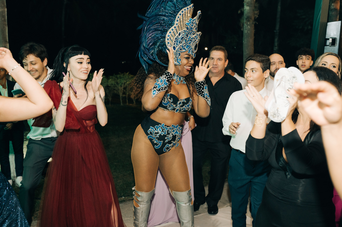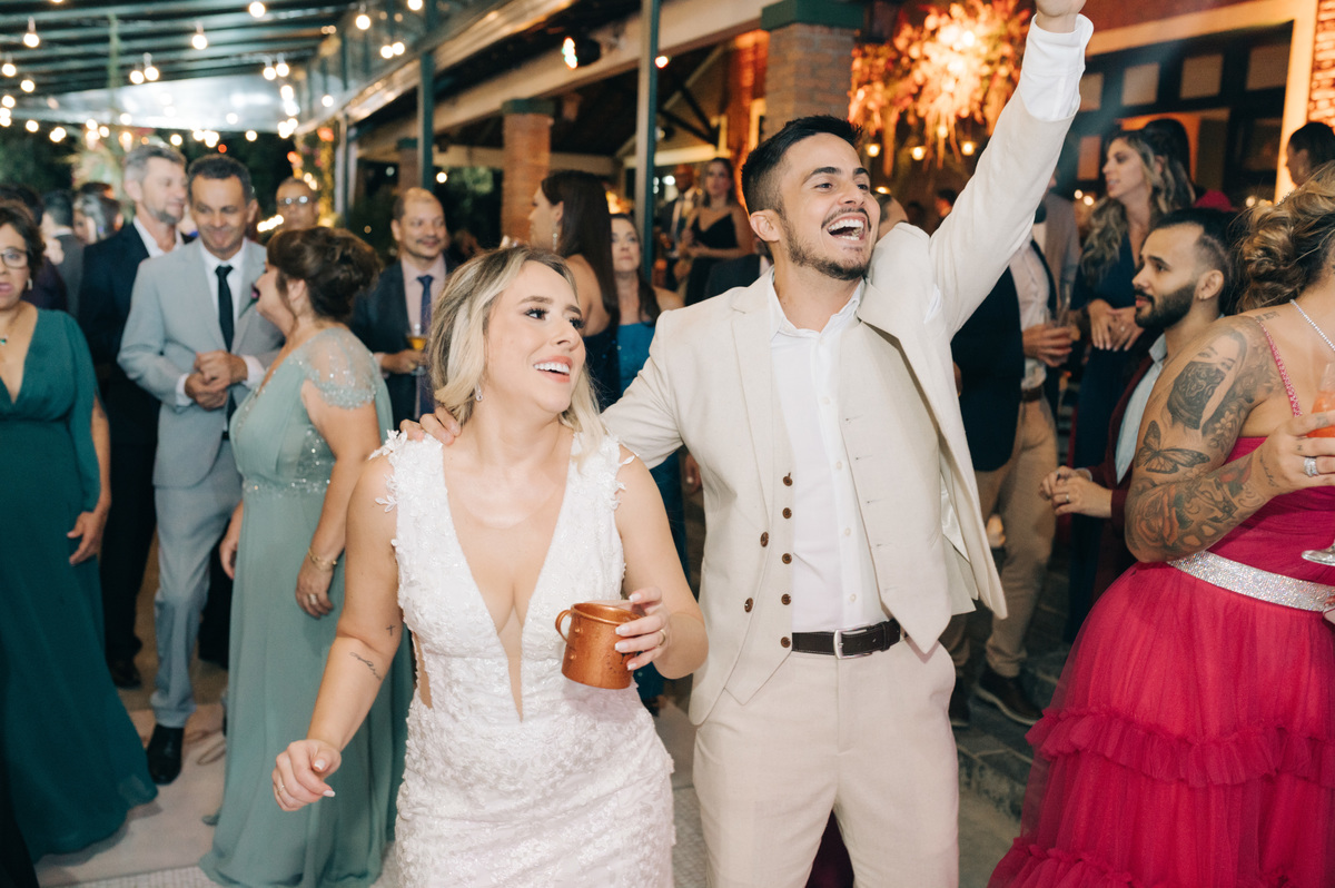 À medida que a cerimônia avançava e o dia se transformava em noite, o local ganhava uma nova atmosfera. Luzes suaves foram acesas, criando um ambiente acolhedor e íntimo para a festa que estava por vir. A saída dos noivos, agora marido e mulher, ocorreu já ao anoitecer, sob um céu estrelado que parecia celebrar a união que tinha acabado de acontecer.