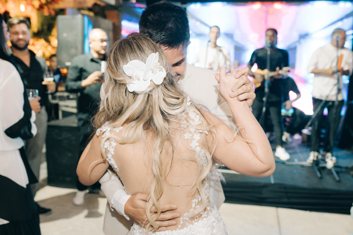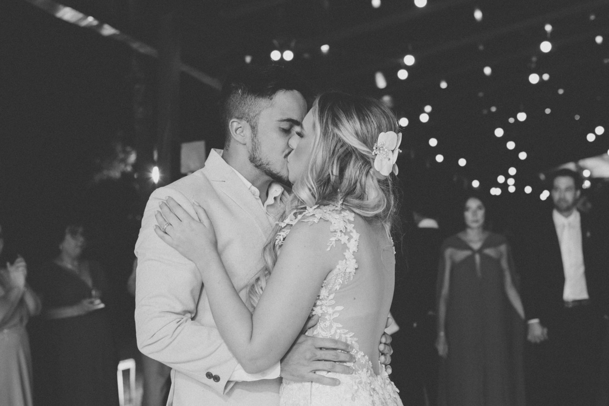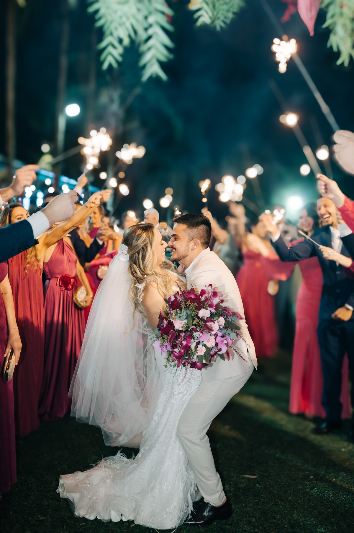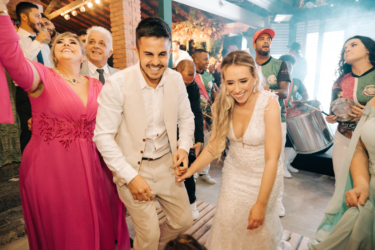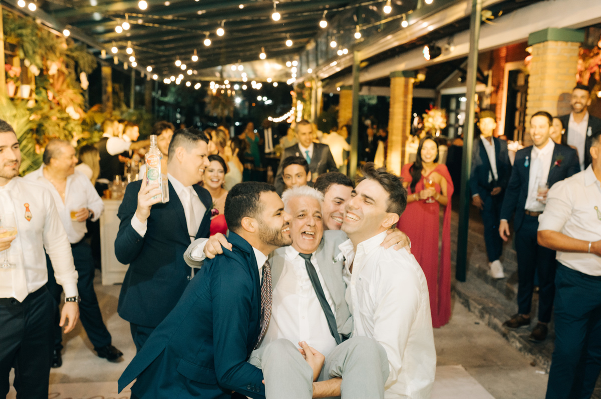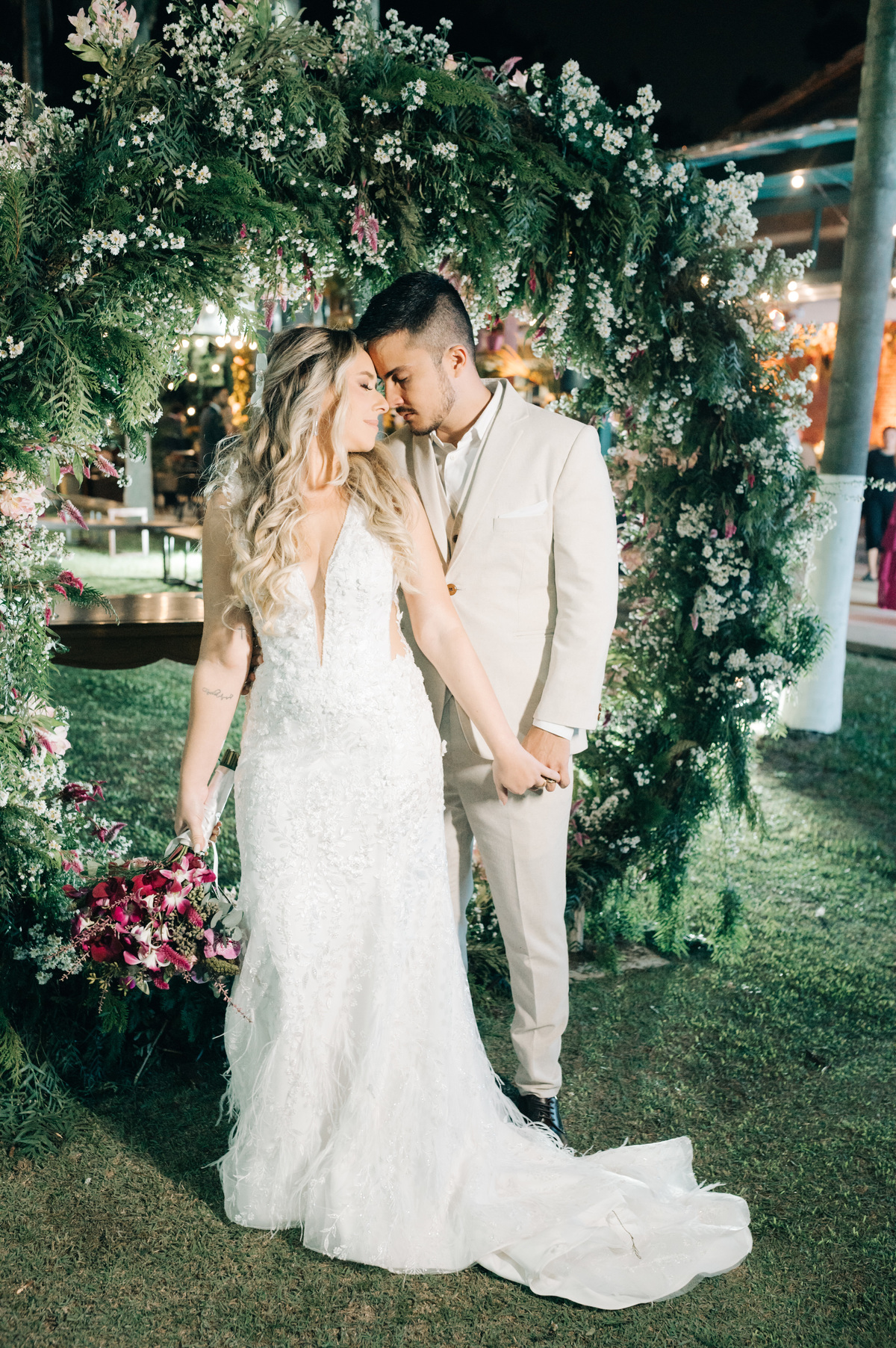 À medida que a cerimônia avançava e o dia se transformava em noite, o local ganhava uma nova atmosfera. Luzes suaves foram acesas, criando um ambiente acolhedor e íntimo para a festa que estava por vir. A saída dos noivos, agora marido e mulher, ocorreu já ao anoitecer, sob um céu estrelado que parecia celebrar a união que tinha acabado de acontecer.