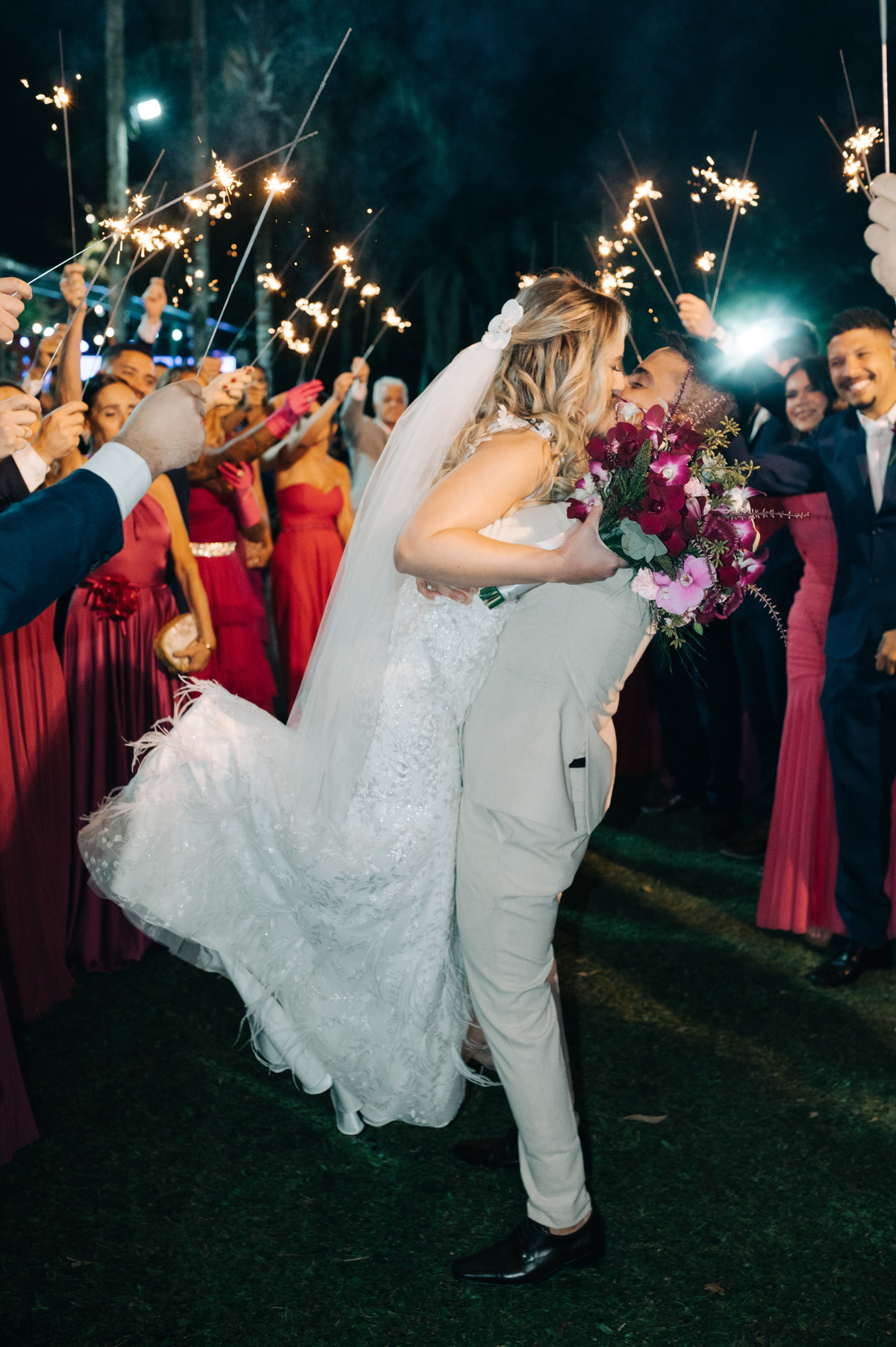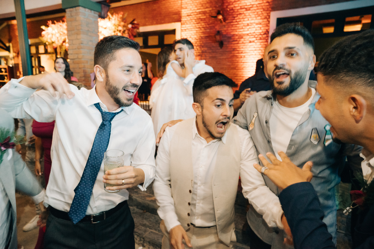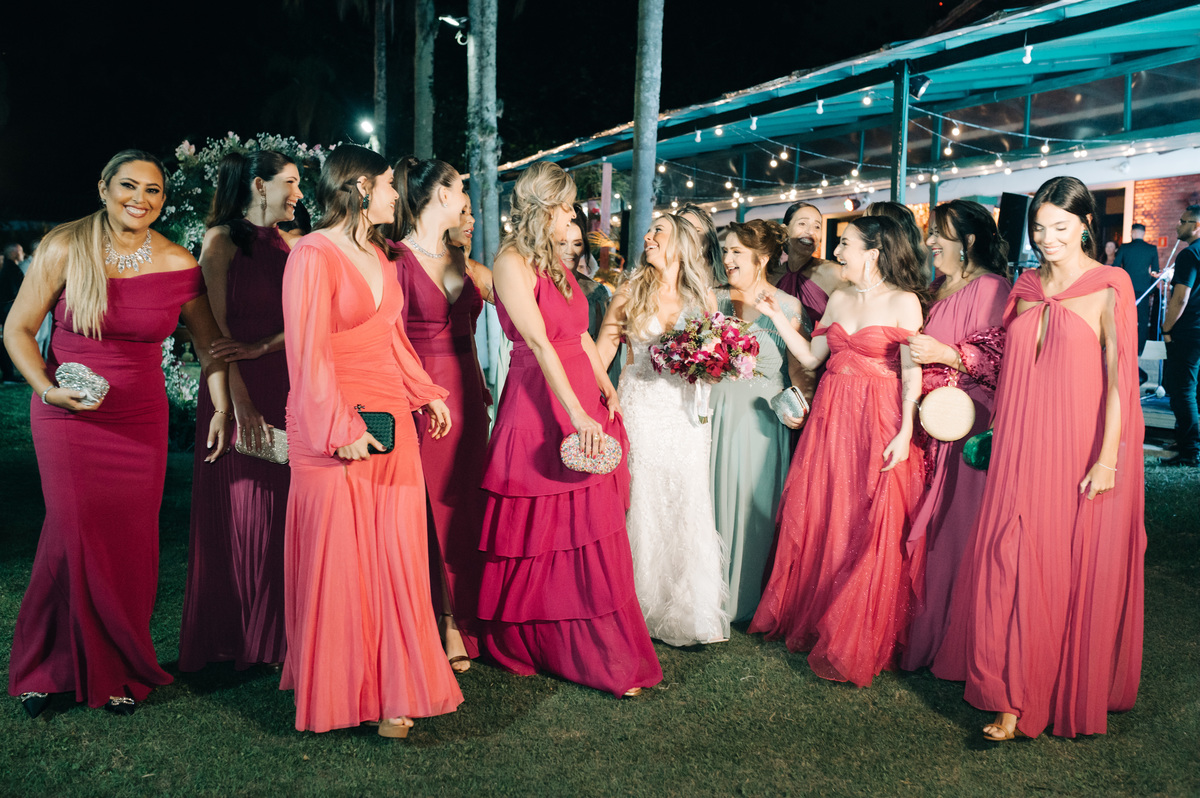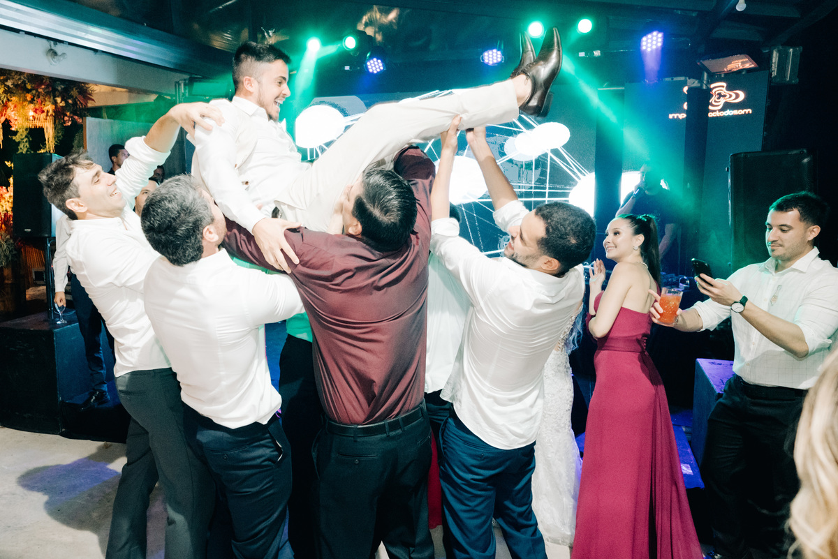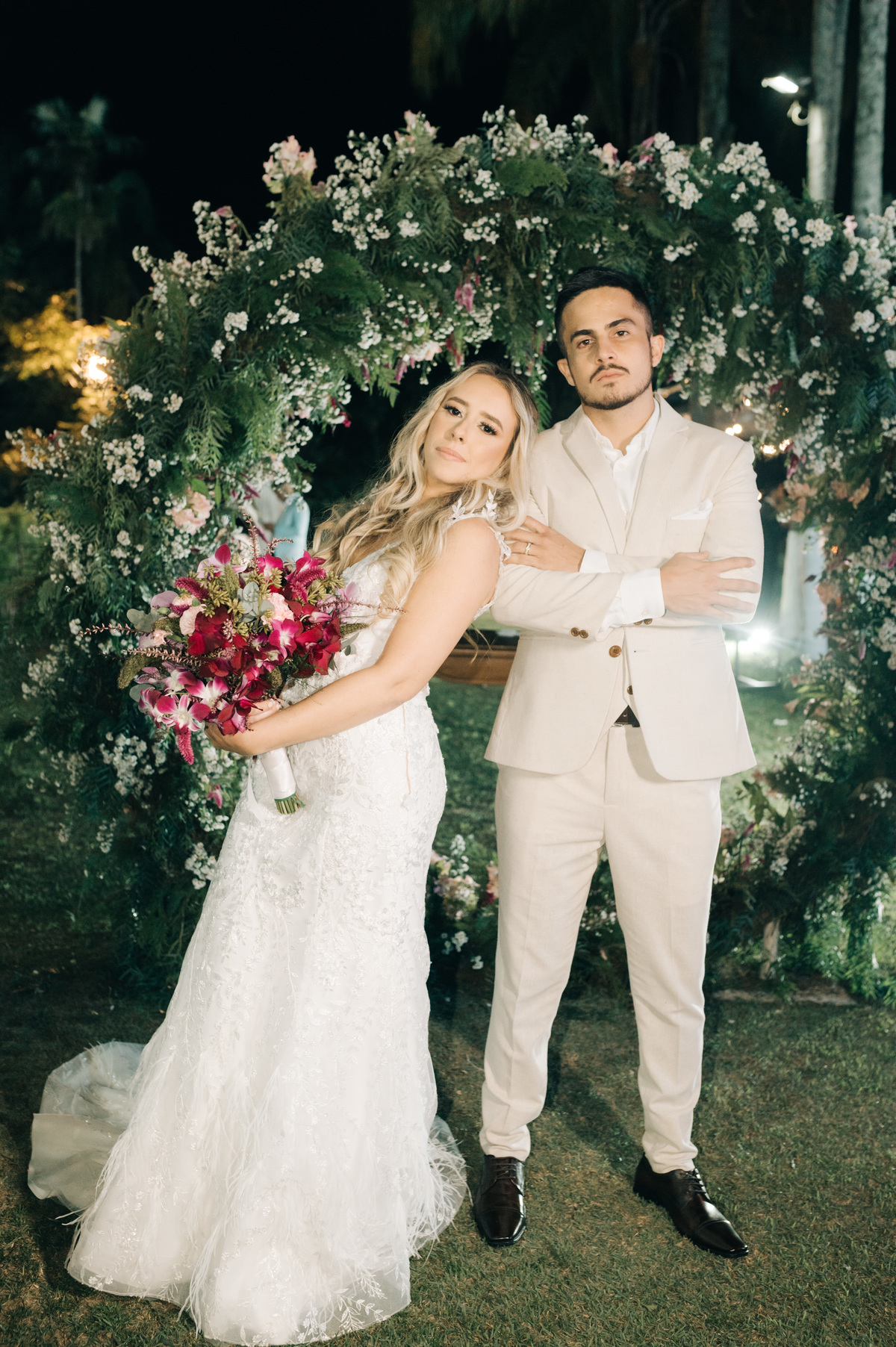 À medida que a cerimônia avançava e o dia se transformava em noite, o local ganhava uma nova atmosfera. Luzes suaves foram acesas, criando um ambiente acolhedor e íntimo para a festa que estava por vir. A saída dos noivos, agora marido e mulher, ocorreu já ao anoitecer, sob um céu estrelado que parecia celebrar a união que tinha acabado de acontecer.