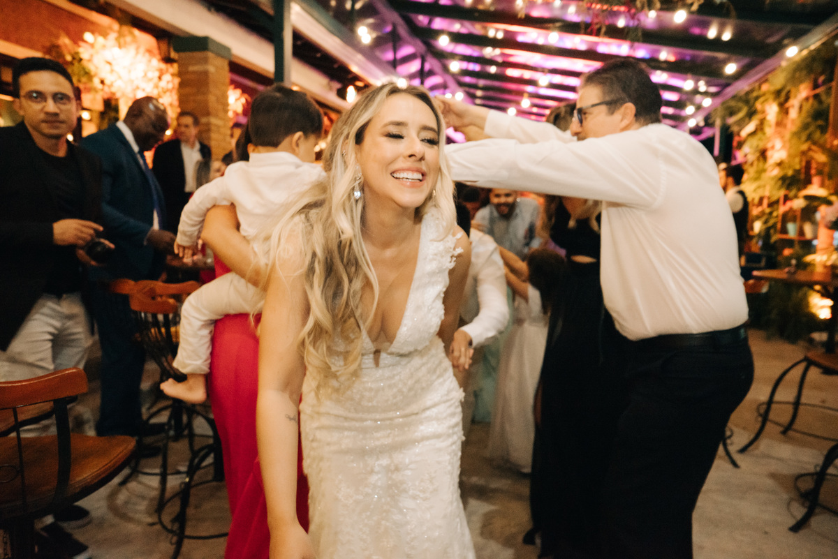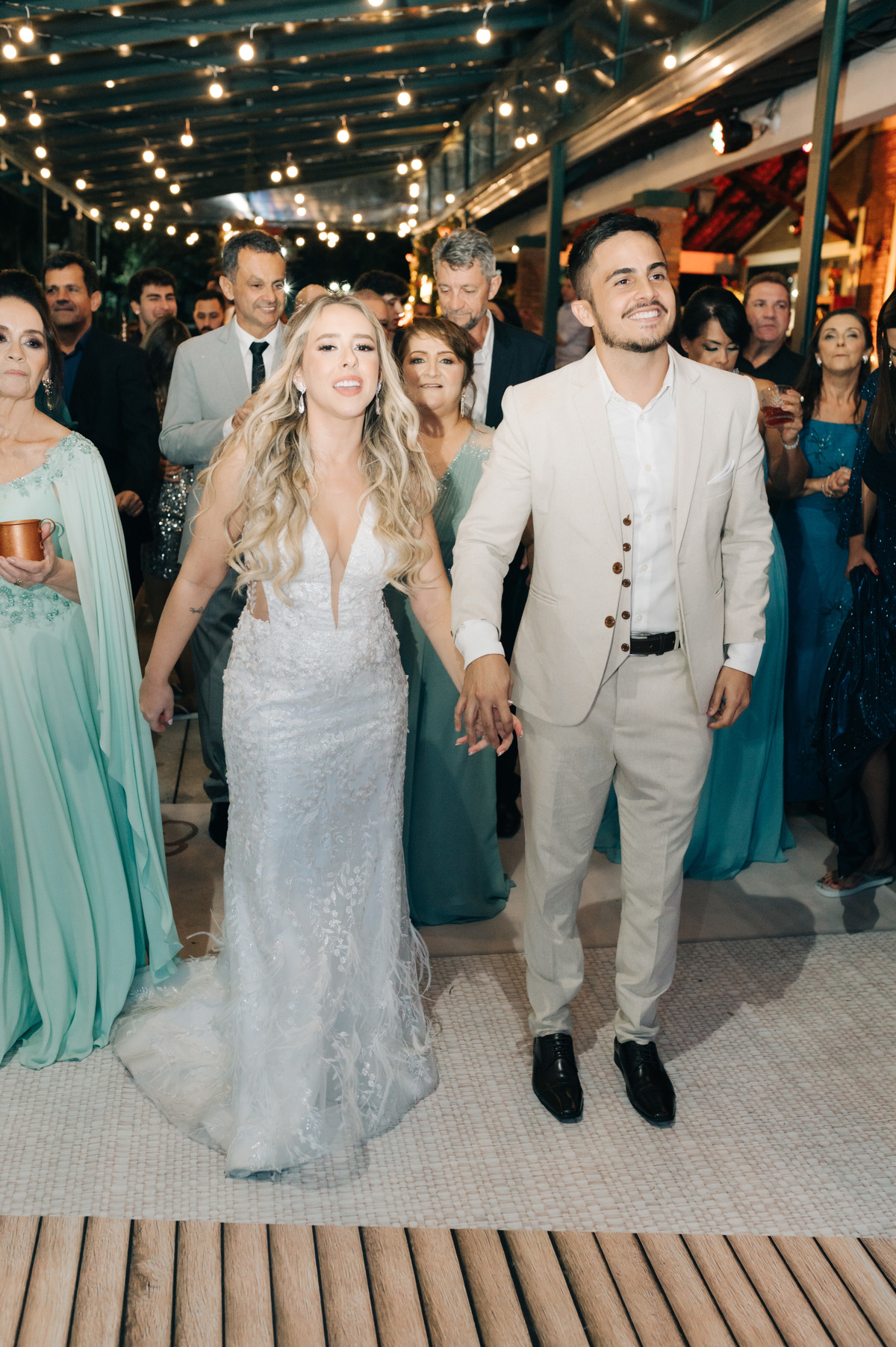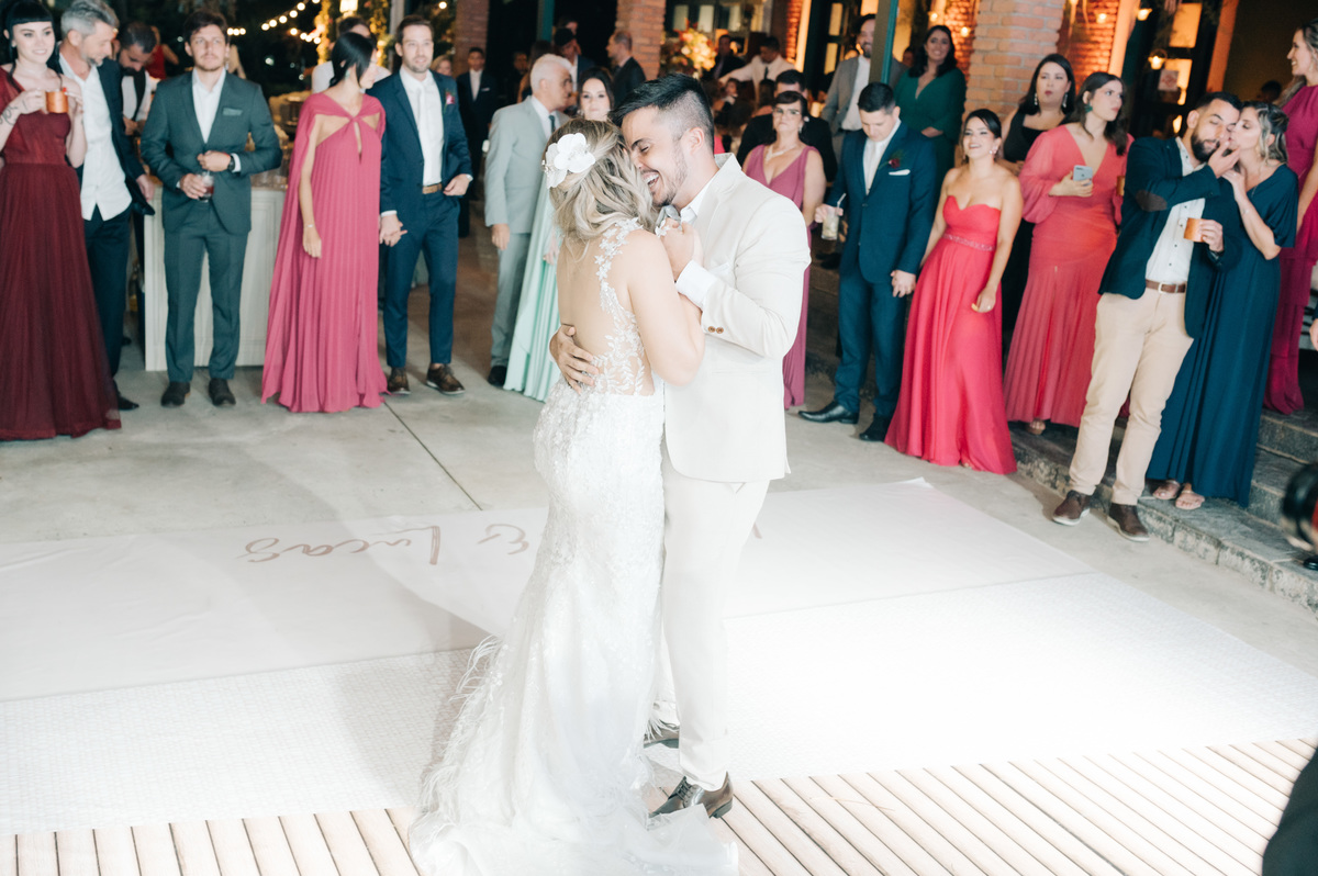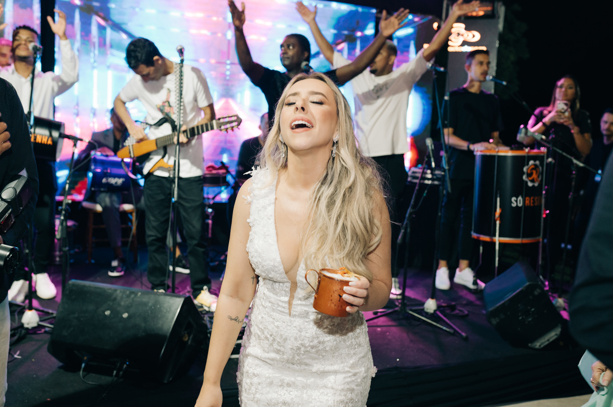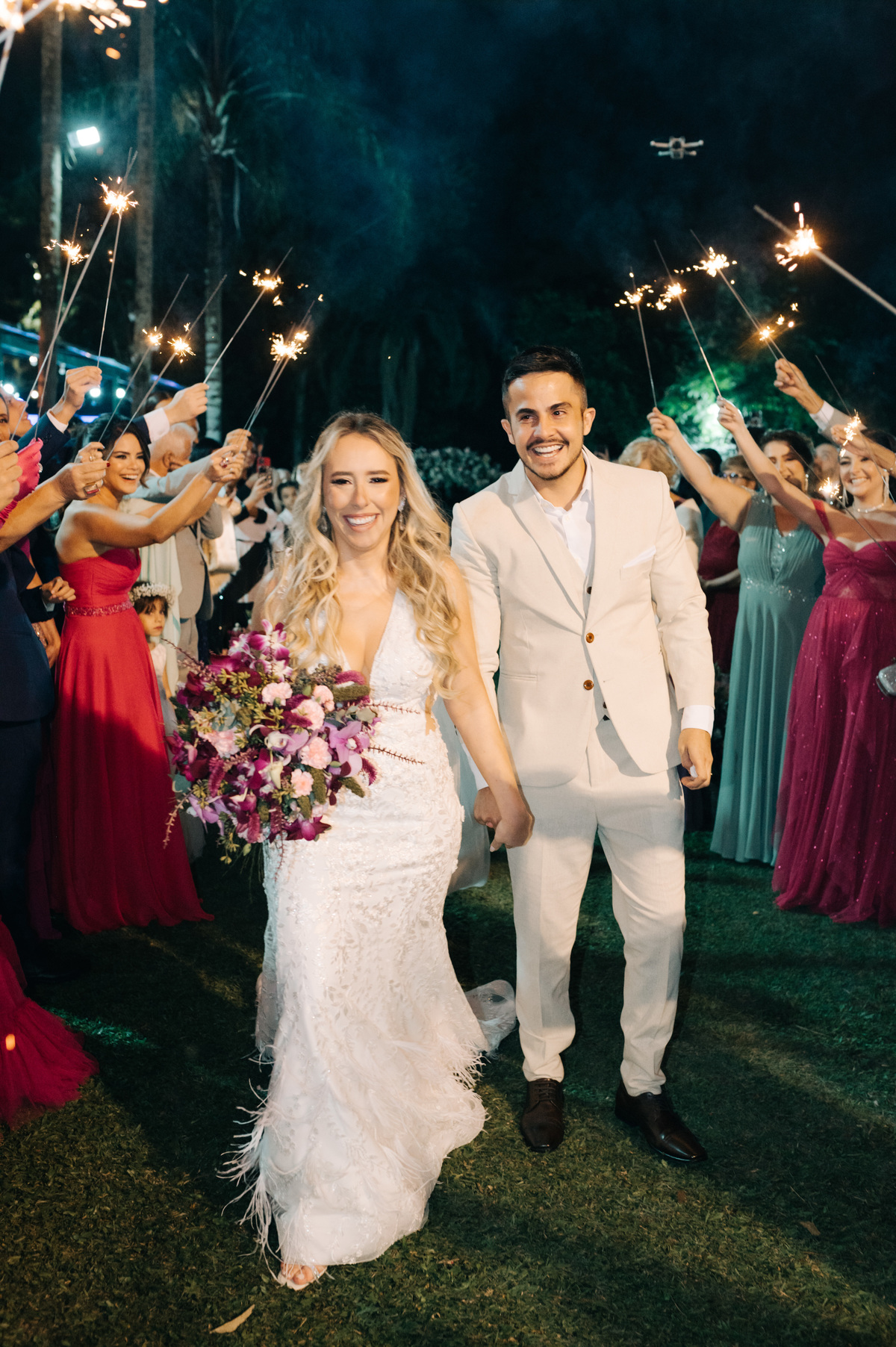 À medida que a cerimônia avançava e o dia se transformava em noite, o local ganhava uma nova atmosfera. Luzes suaves foram acesas, criando um ambiente acolhedor e íntimo para a festa que estava por vir. A saída dos noivos, agora marido e mulher, ocorreu já ao anoitecer, sob um céu estrelado que parecia celebrar a união que tinha acabado de acontecer.