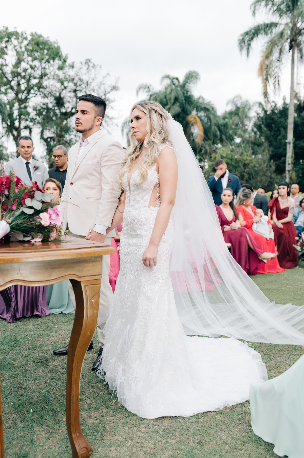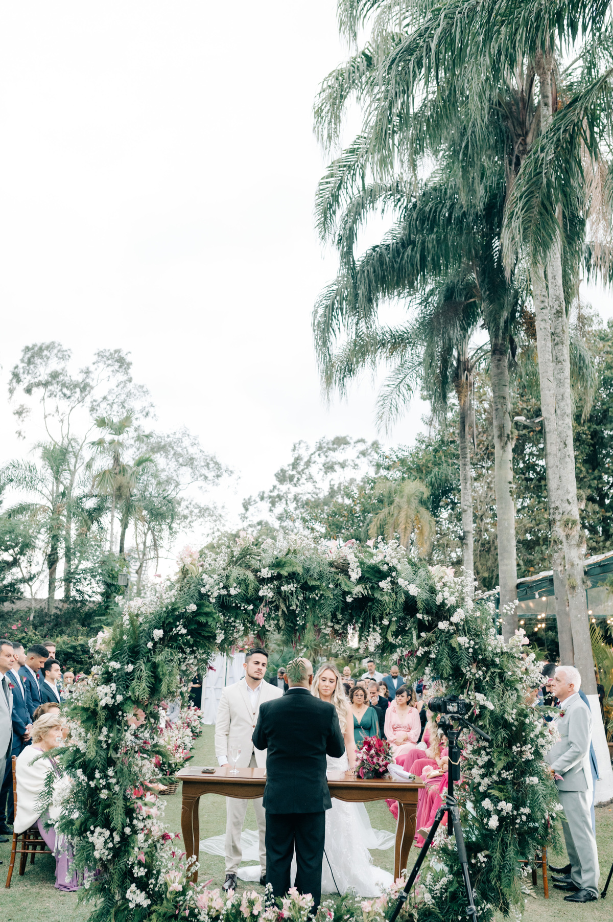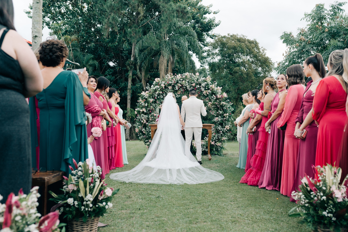 O casamento começou ao entardecer, em um dia nublado que conferiu uma aura única à ocasião. As nuvens pintaram o céu com tons suaves, criando uma paleta de cores romântica que se refletia nas emoções compartilhadas por todos os presentes.