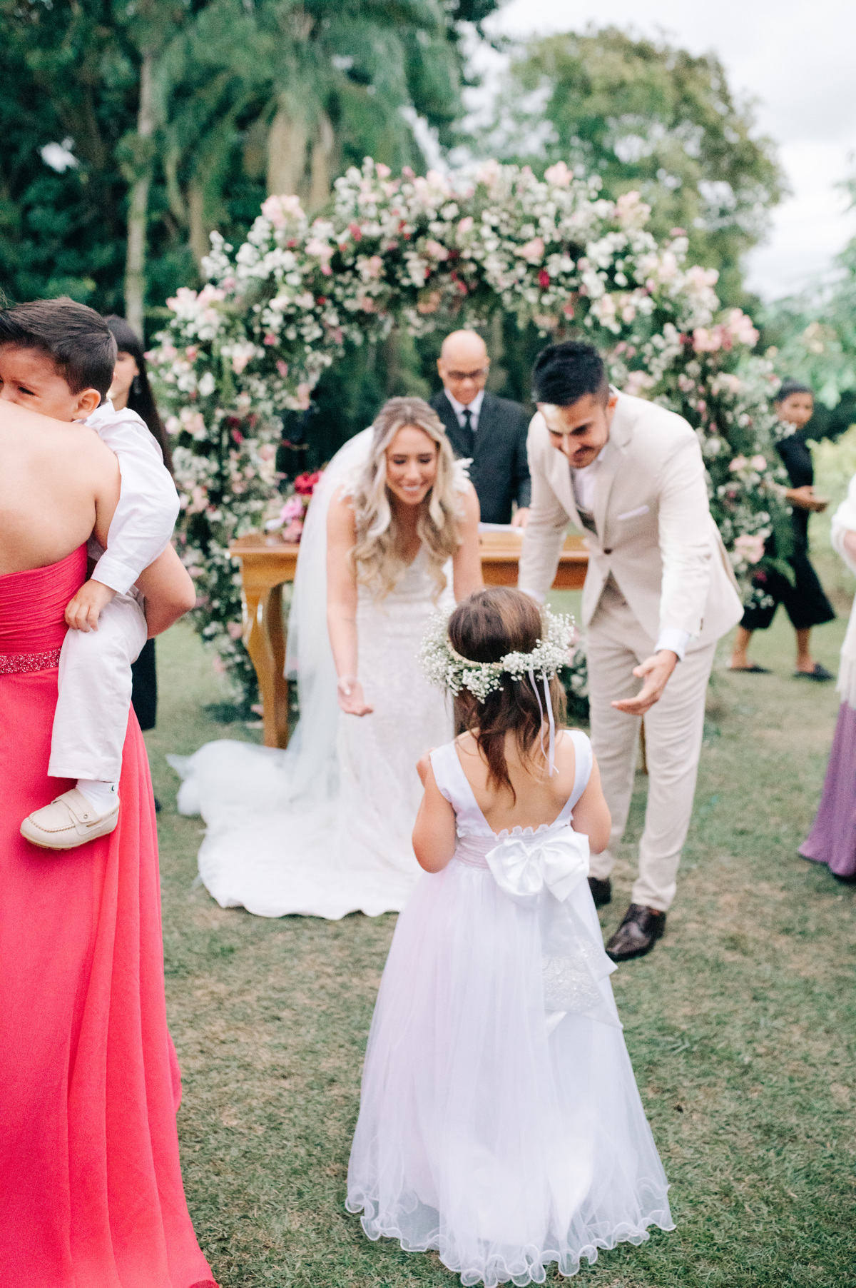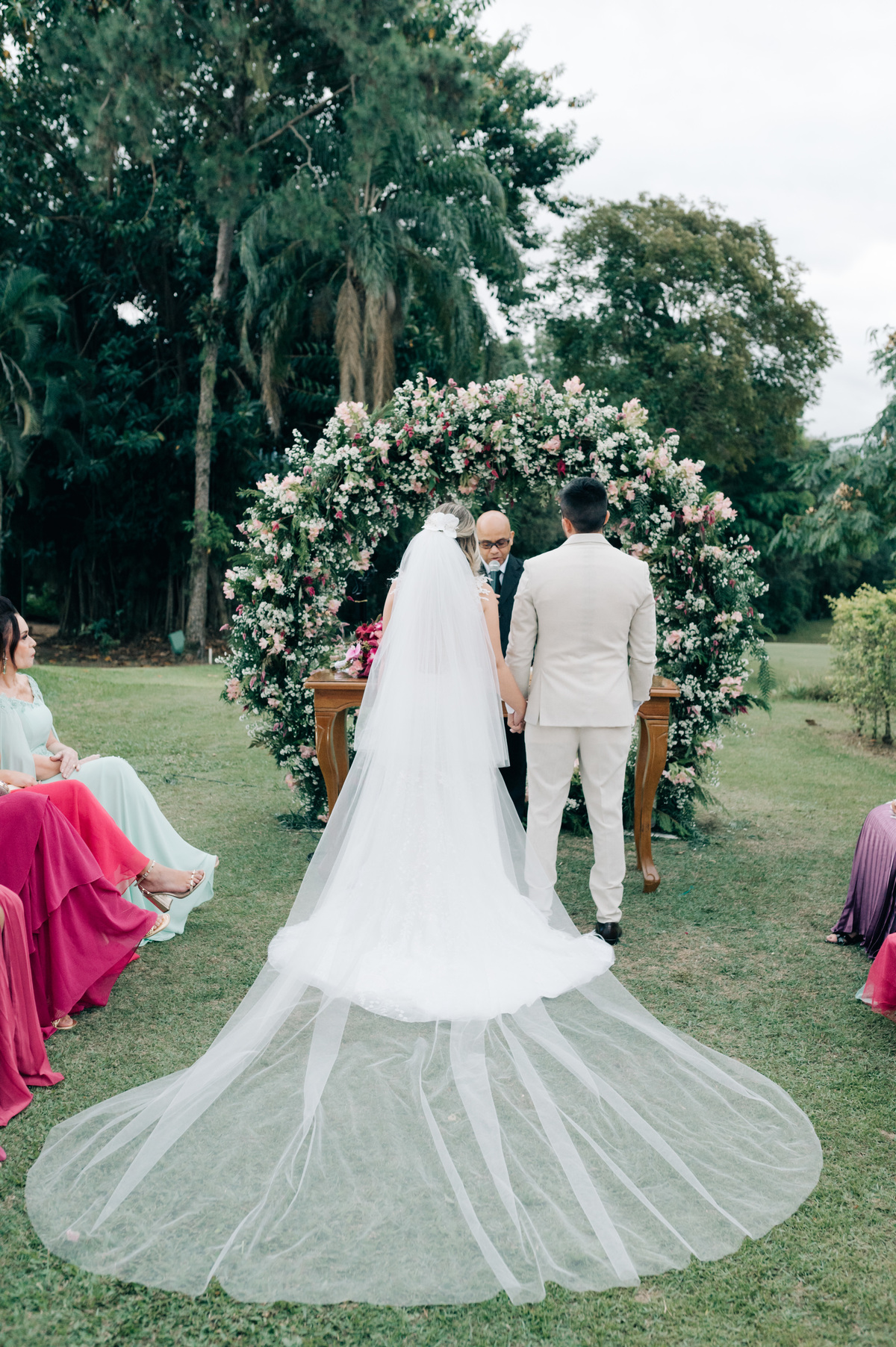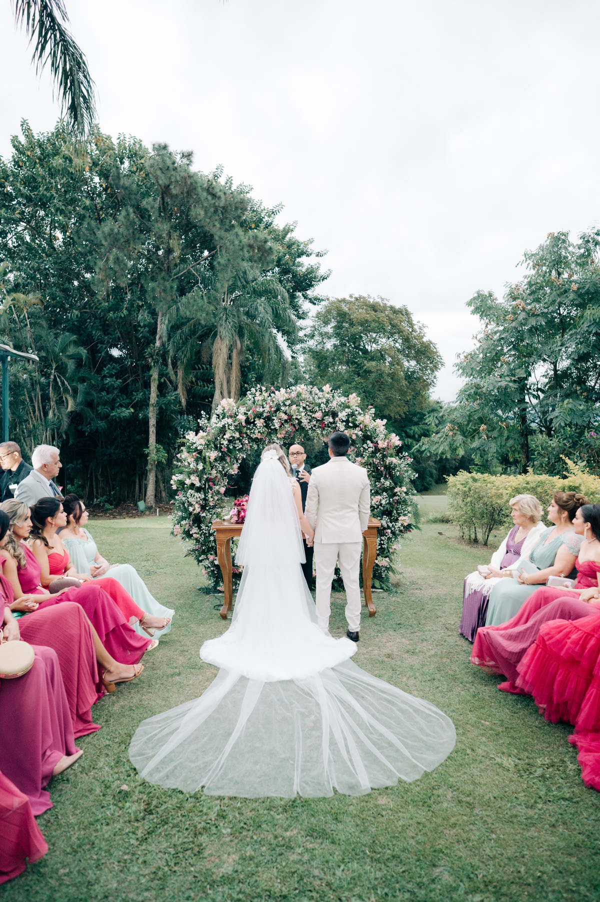 O casamento começou ao entardecer, em um dia nublado que conferiu uma aura única à ocasião. As nuvens pintaram o céu com tons suaves, criando uma paleta de cores romântica que se refletia nas emoções compartilhadas por todos os presentes.