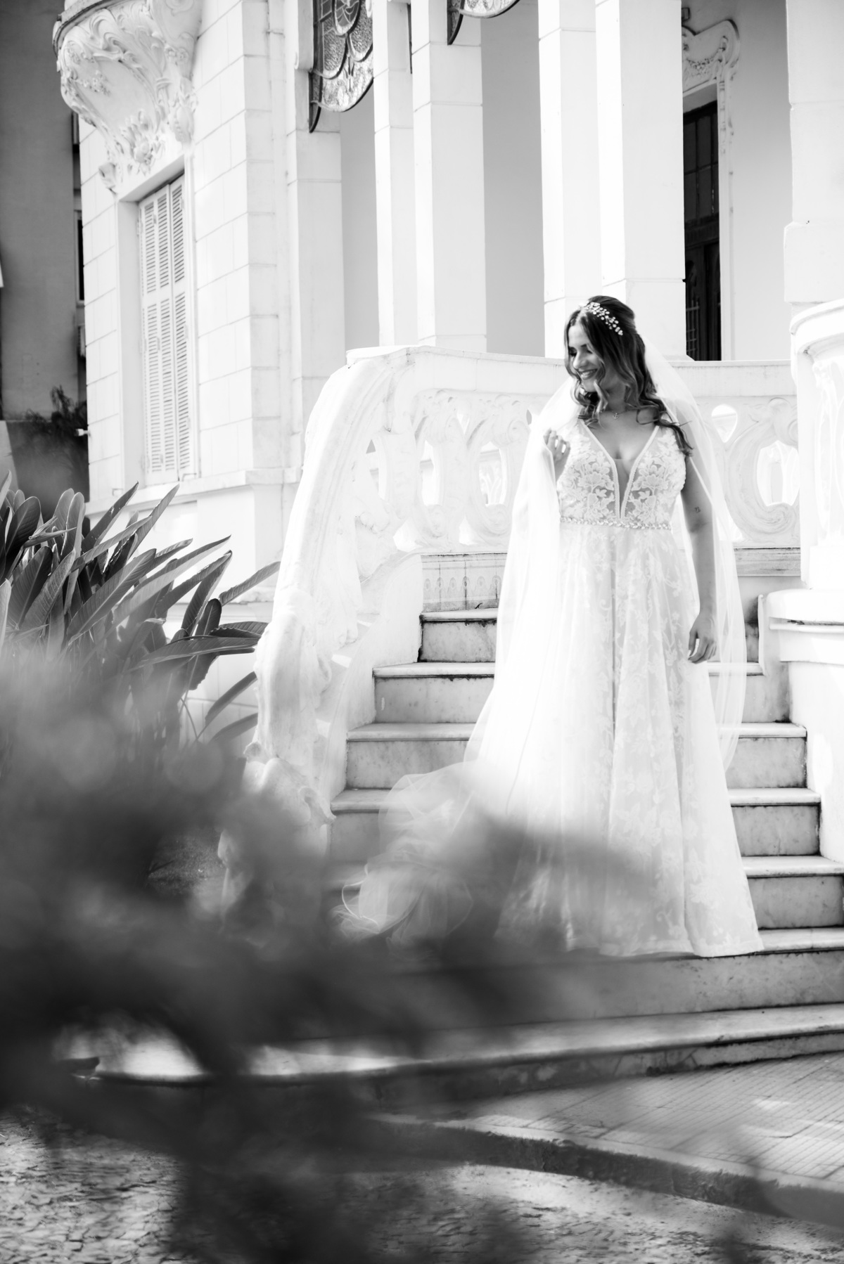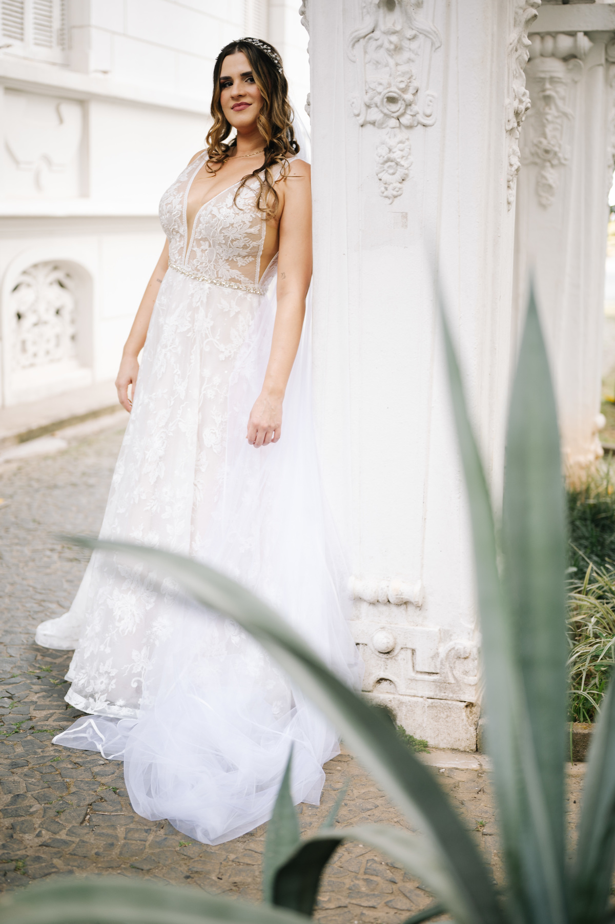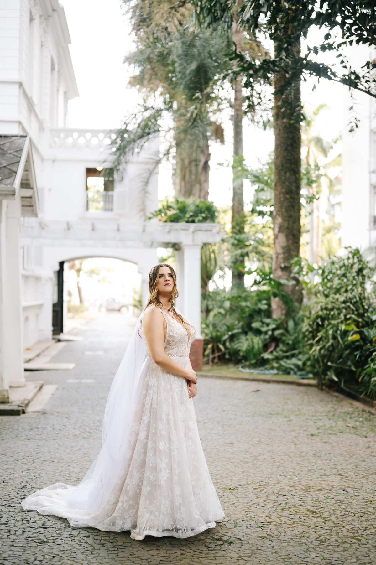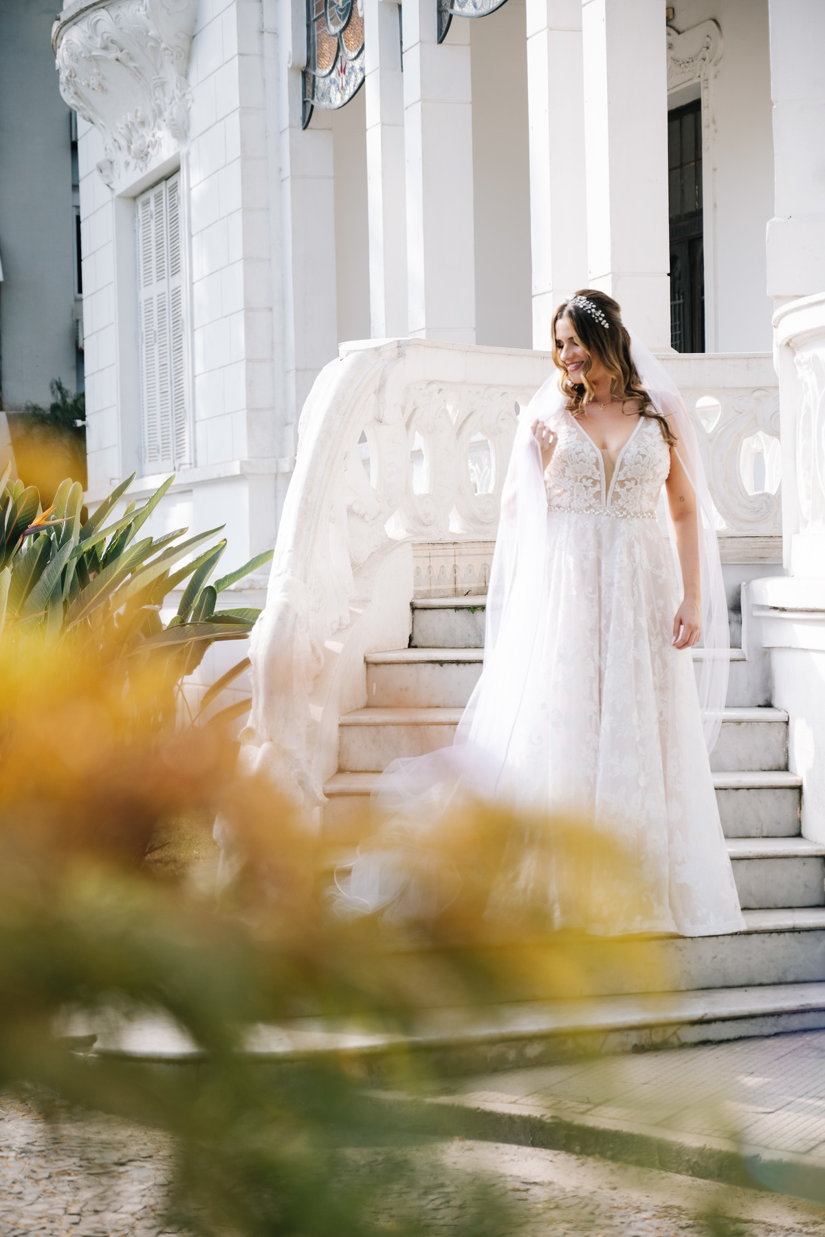 Antes de seguir para o “sim”, fizemos as fotos protocolares da noiva na Pinacoteca de Santos. A arquitetura clássica e os detalhes artísticos do espaço deram um toque sofisticado às imagens, criando um contraste lindo com a proposta mais rústica do casamento.