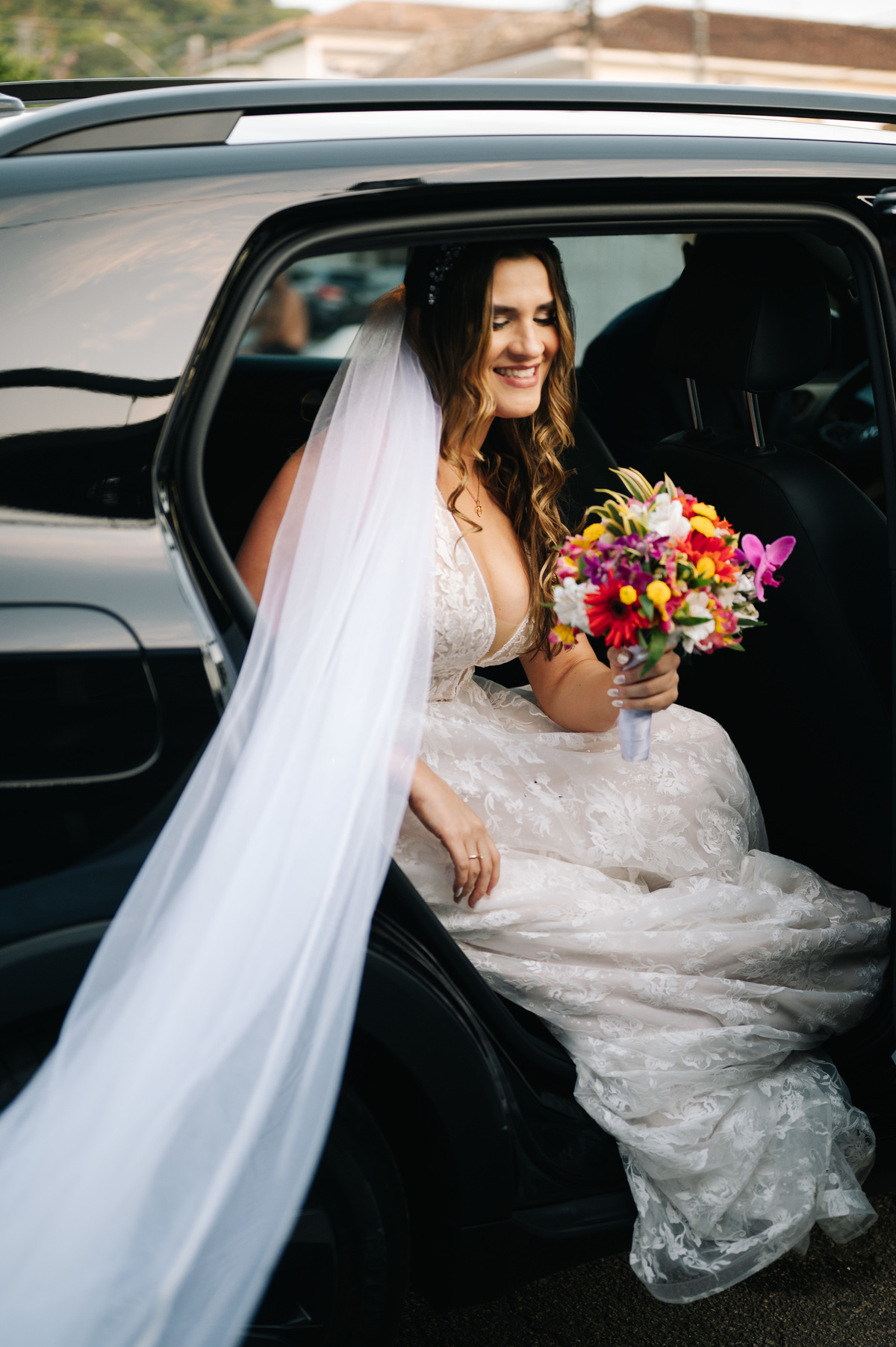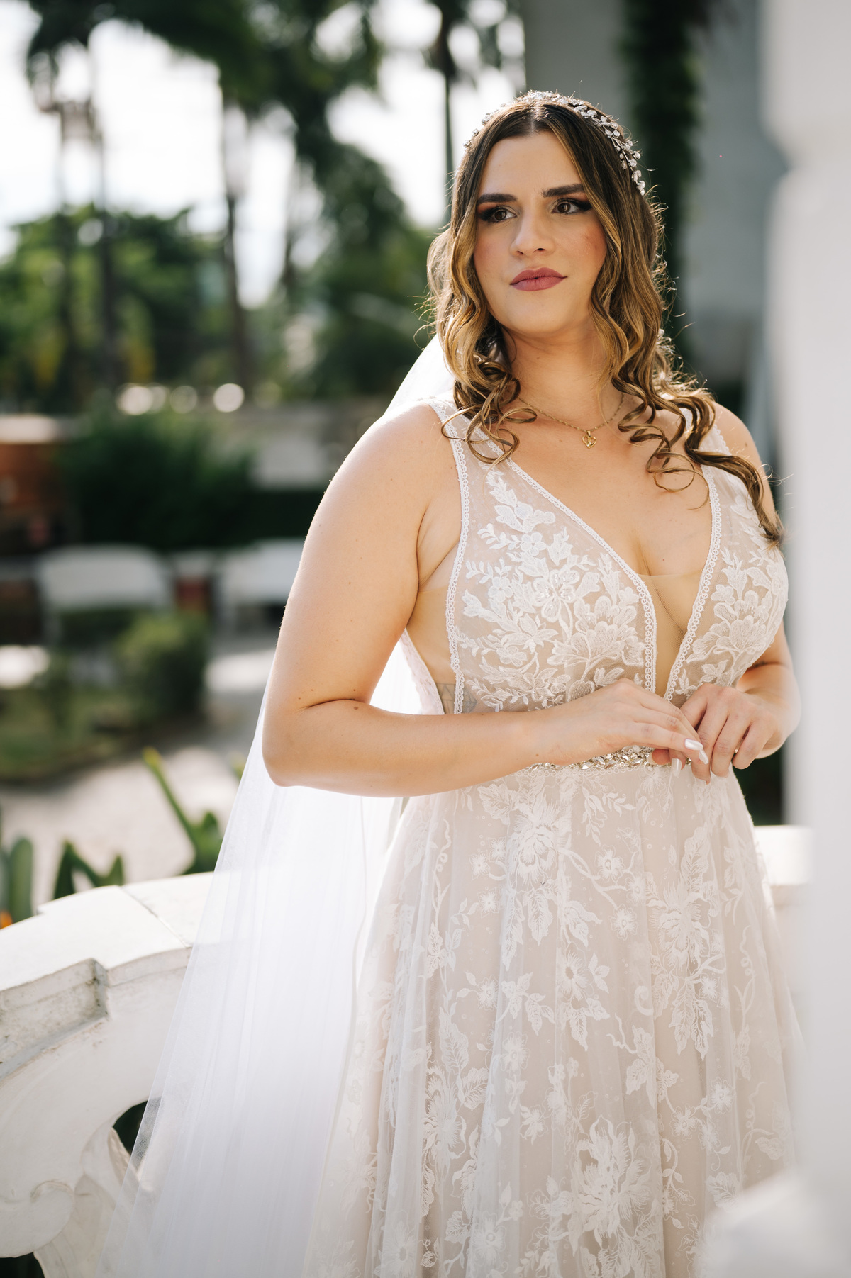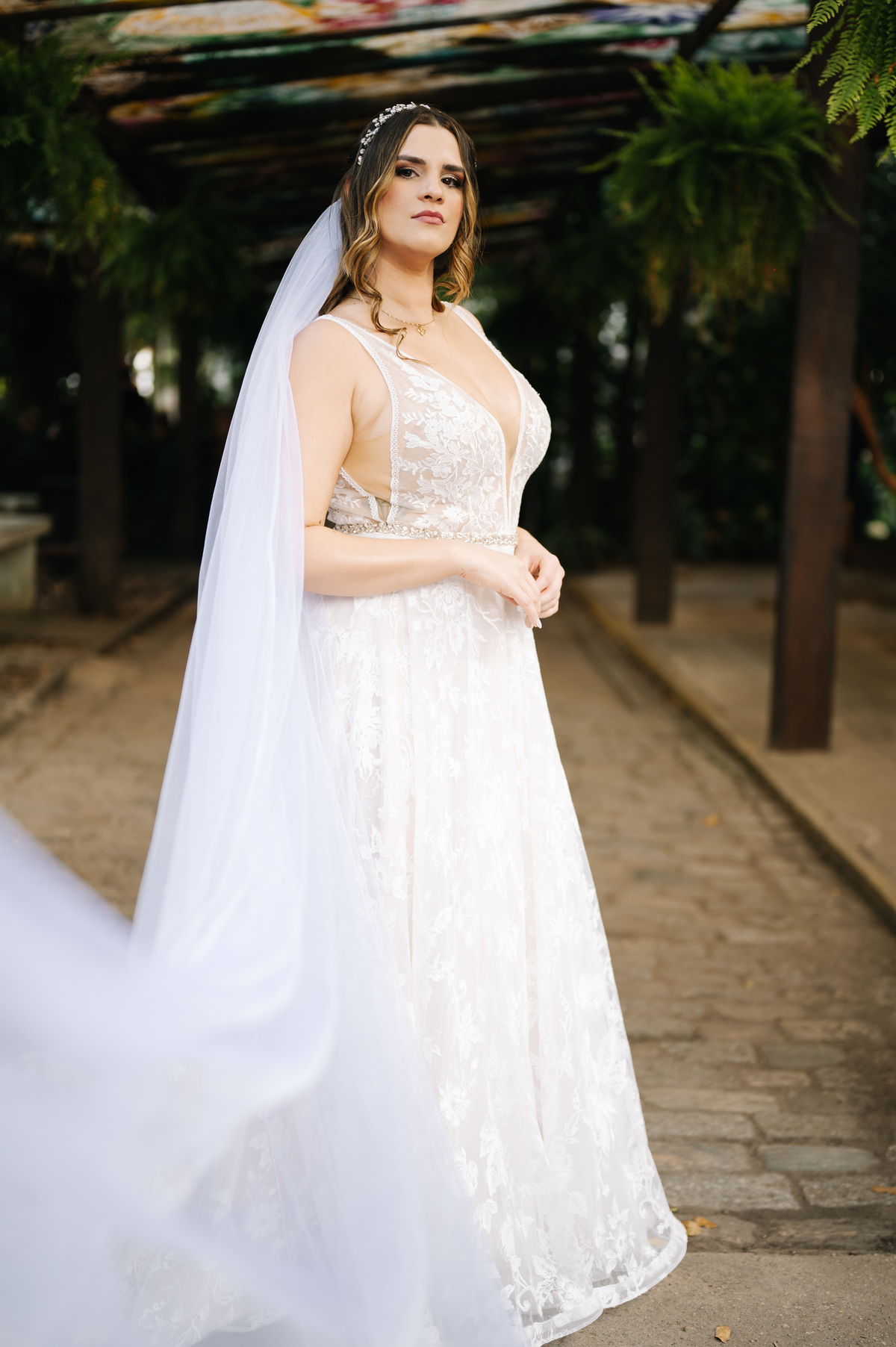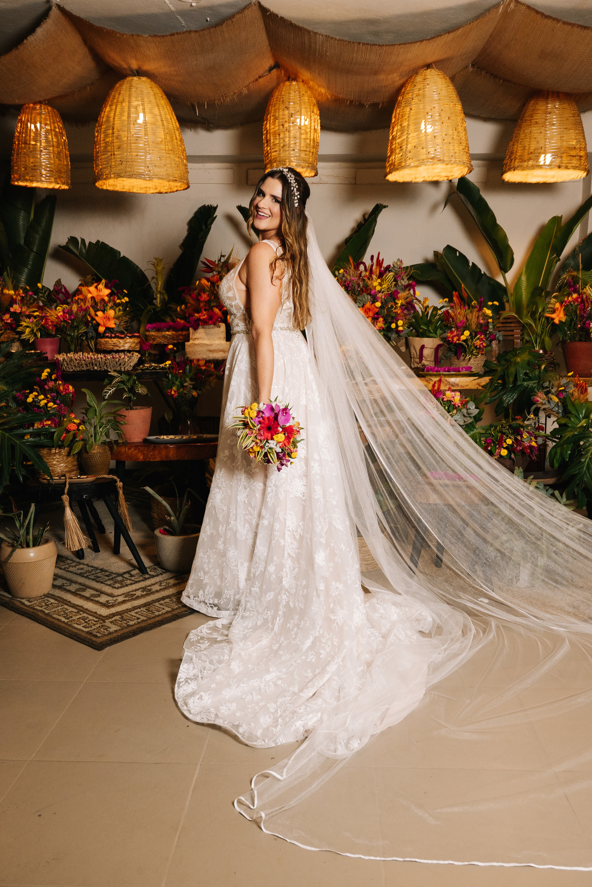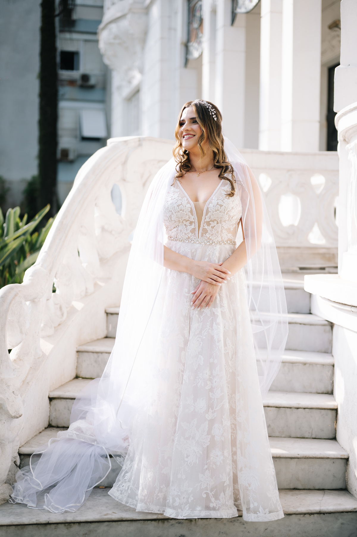 Antes de seguir para o “sim”, fizemos as fotos protocolares da noiva na Pinacoteca de Santos. A arquitetura clássica e os detalhes artísticos do espaço deram um toque sofisticado às imagens, criando um contraste lindo com a proposta mais rústica do casamento.