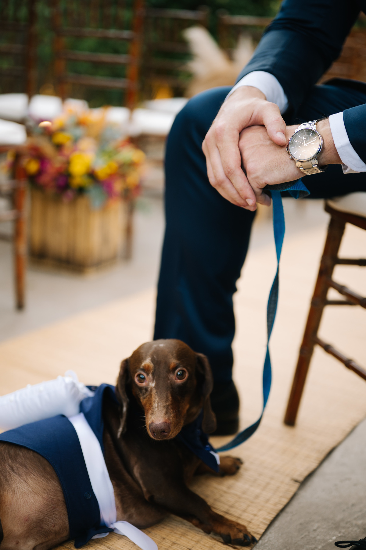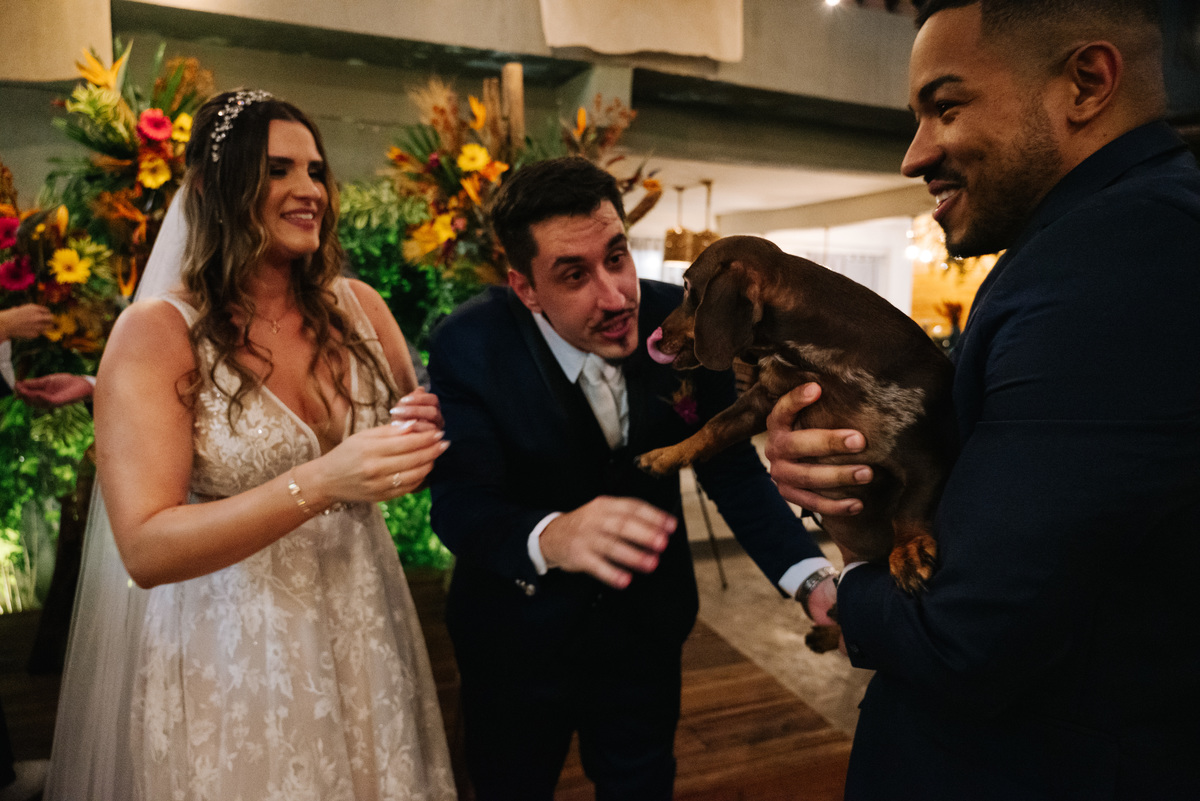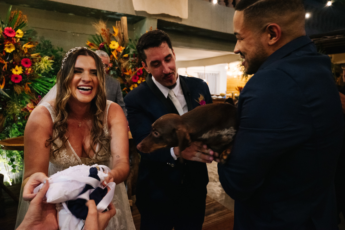 Um dos momentos mais emocionantes da cerimônia foi quando a aliança chegou… trazida pelo cachorrinho do casal! Um detalhe único e cheio de significado, que arrancou sorrisos e emocionou todos os presentes.