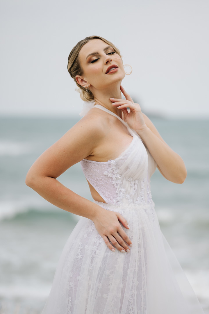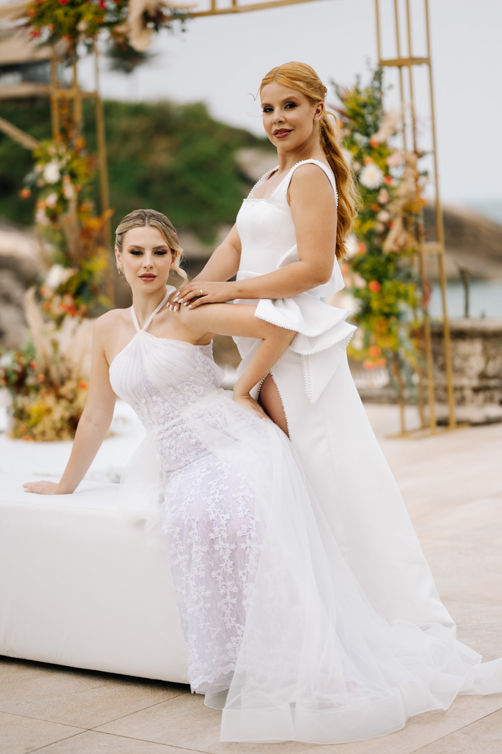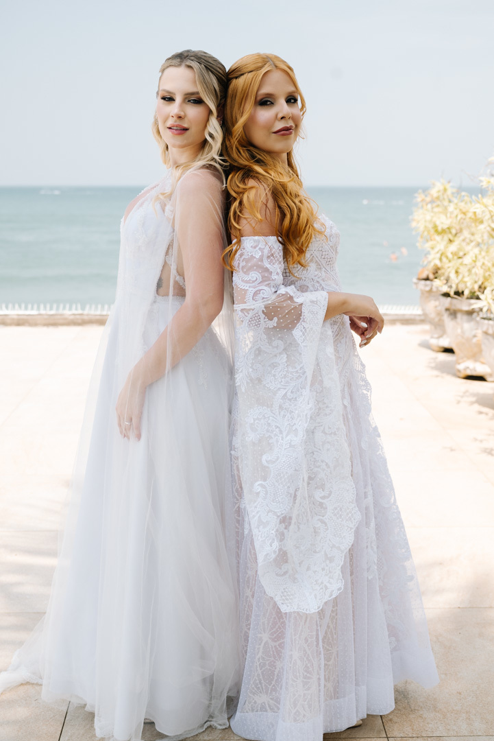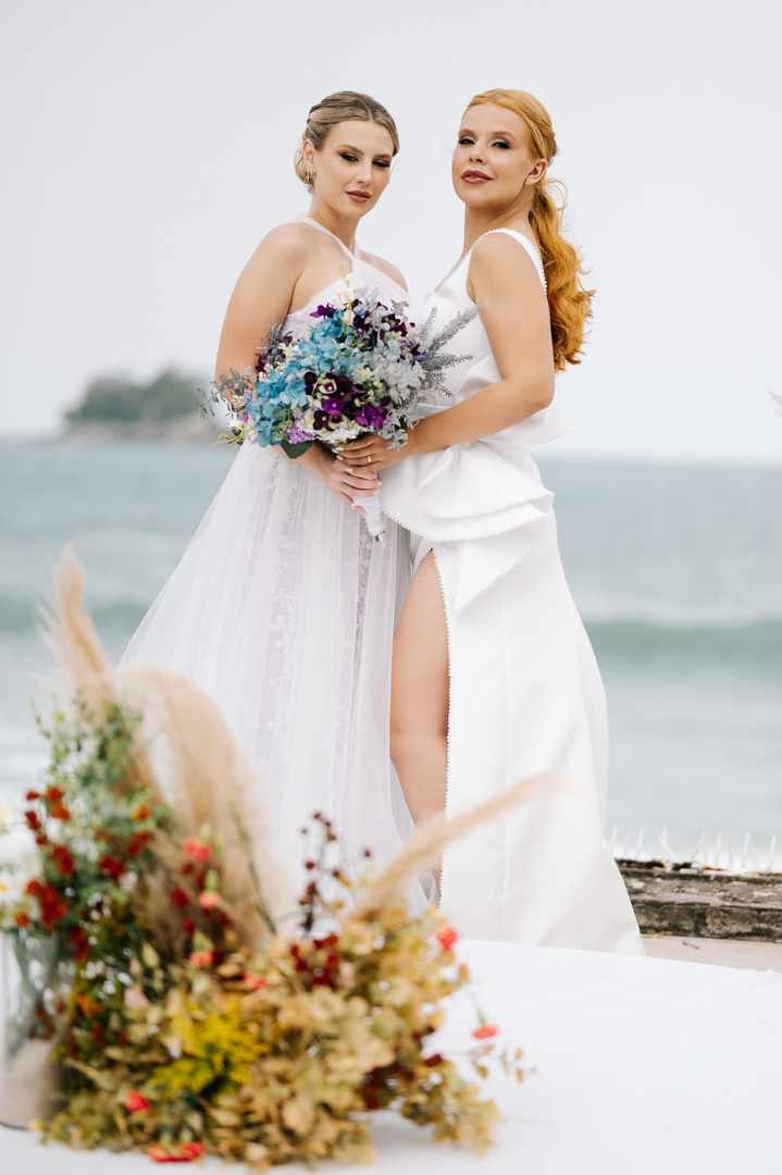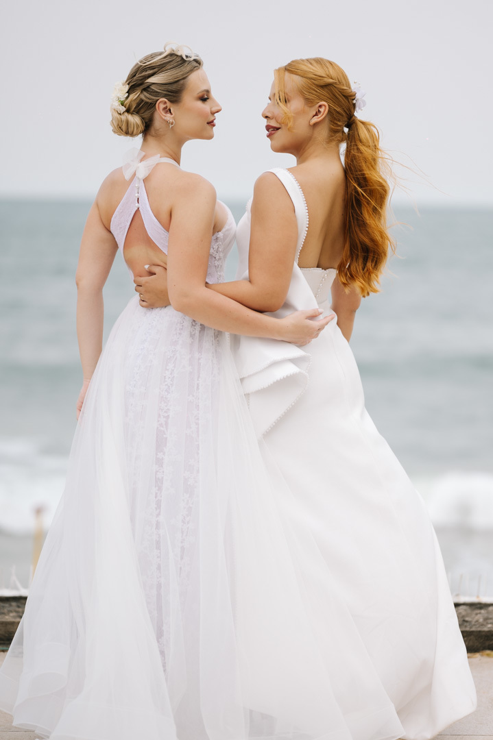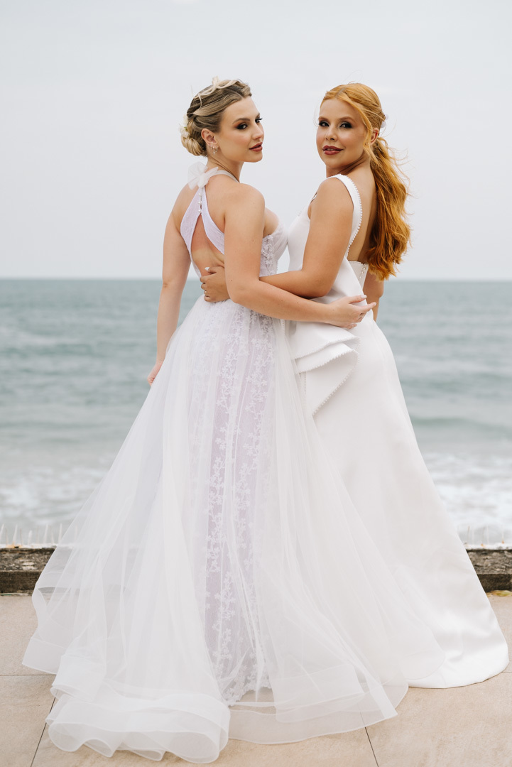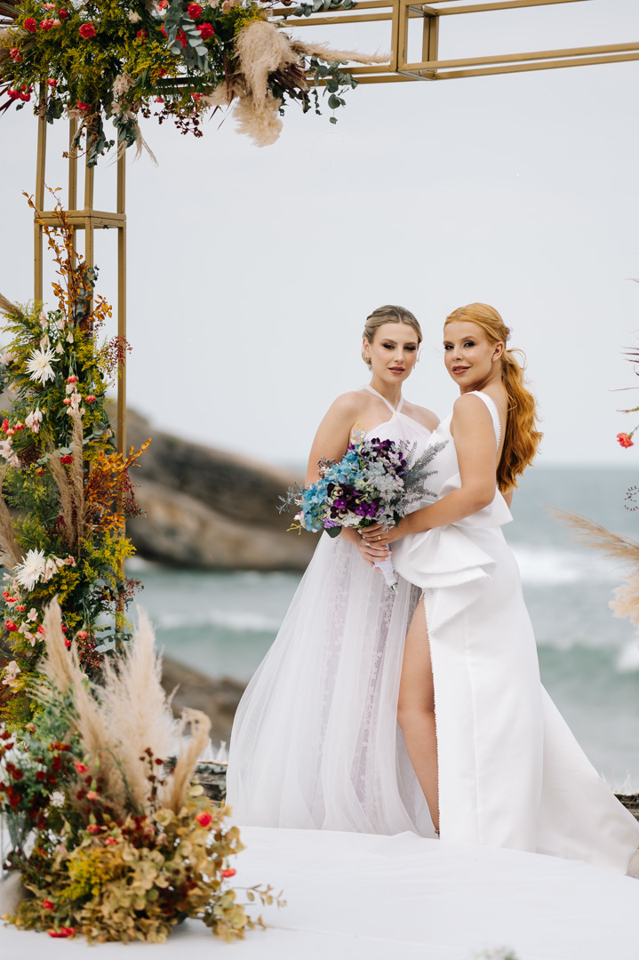 A proposta foi valorizar a conexão entre as noivas, a liberdade de celebrar o amor em meio à natureza e a beleza da simplicidade. O vento, as ondas e a luz dourada de fim de tarde se encarregaram de criar uma moldura natural, mostrando que a praia, por si só, já é um cenário inesquecível para esse momento tão especial.