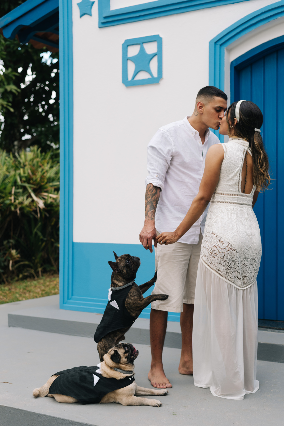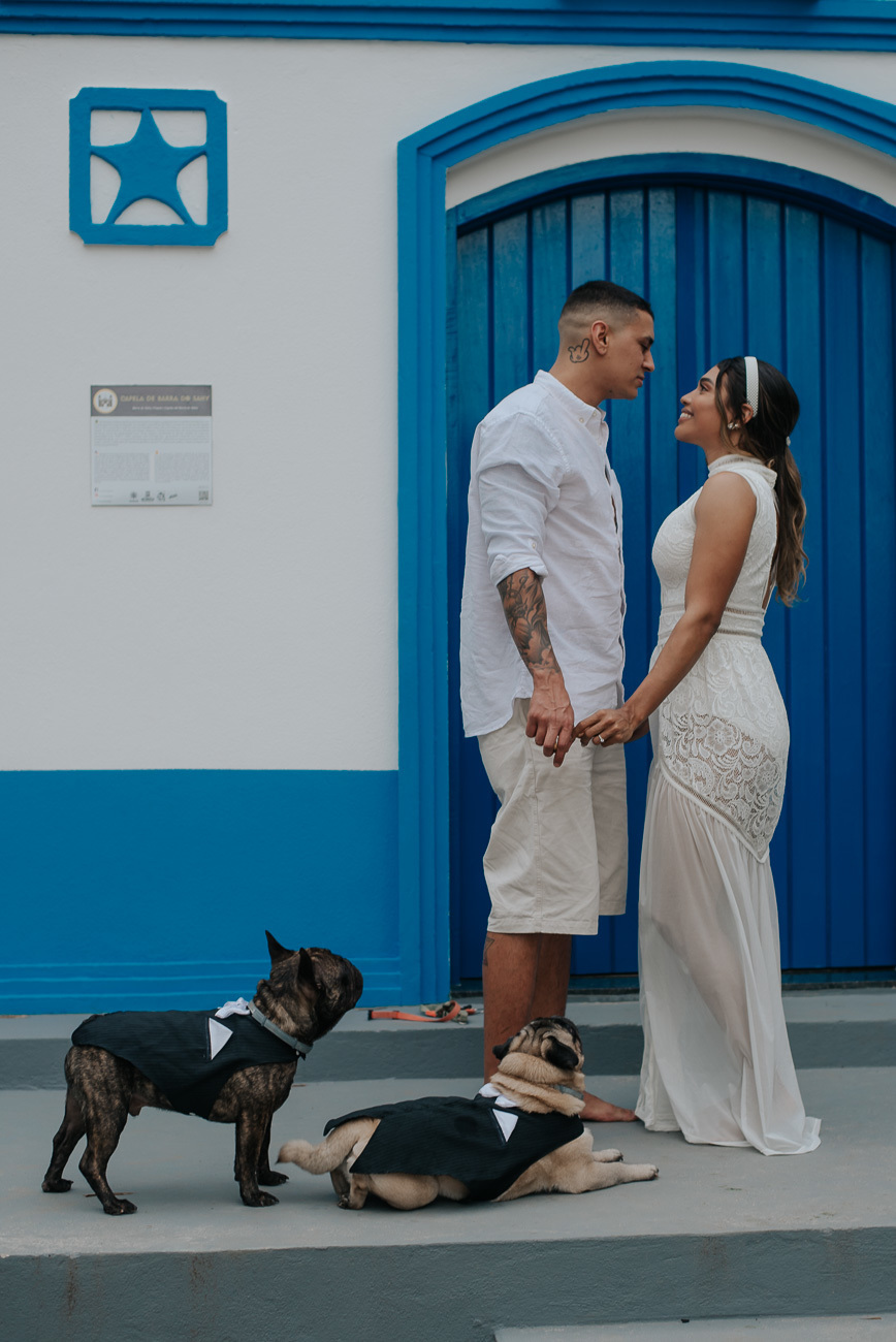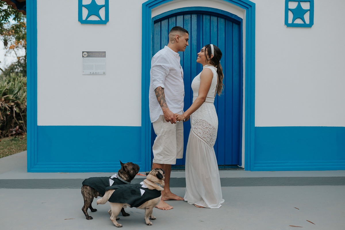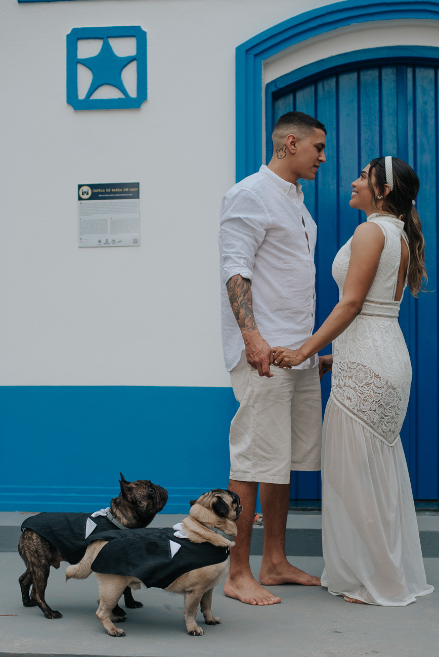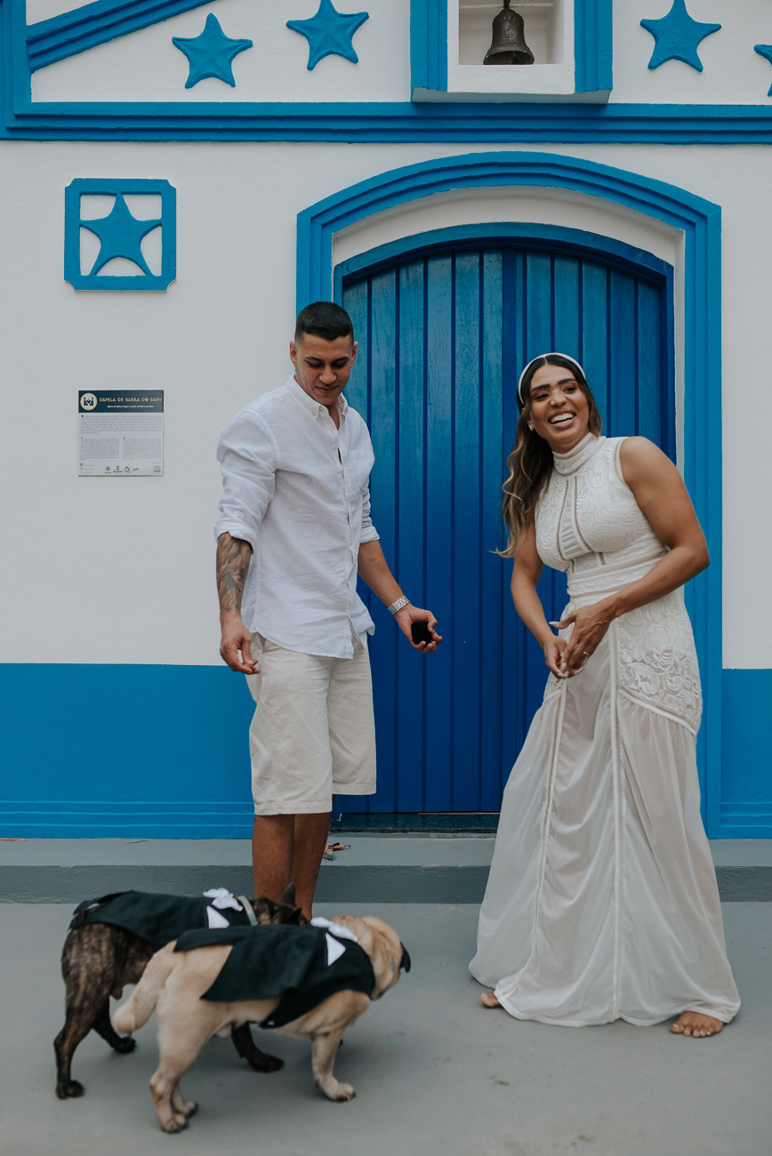 com eles estavam dois convidados especiais o seus cachorros para levar a aliança e serem testemunhas desse casamento na praia,