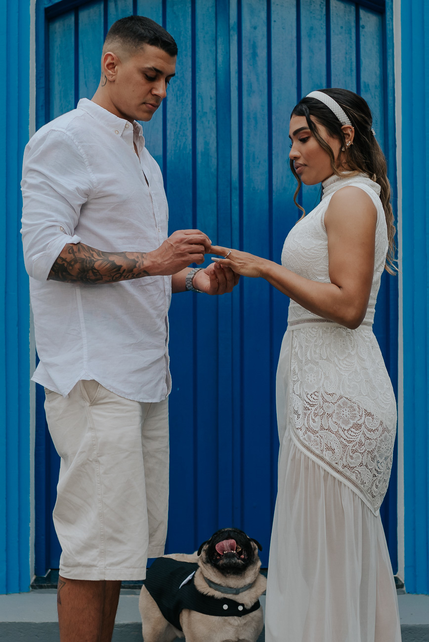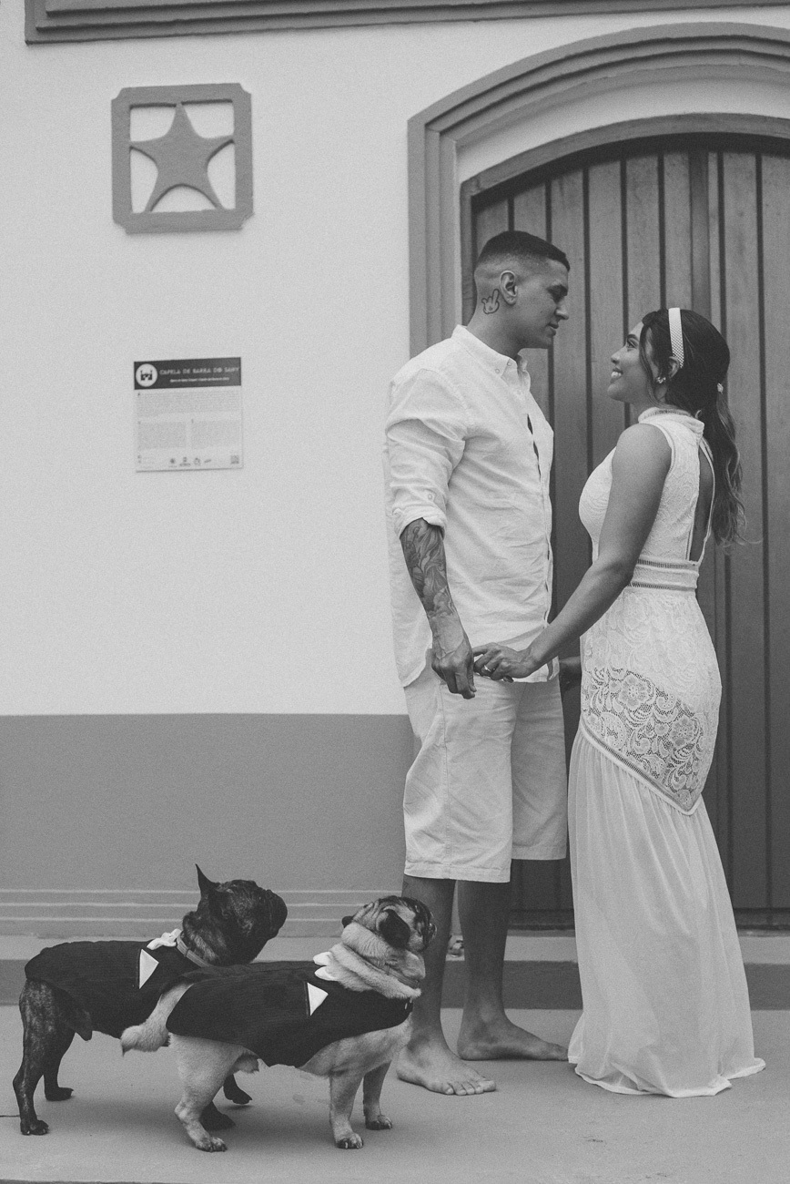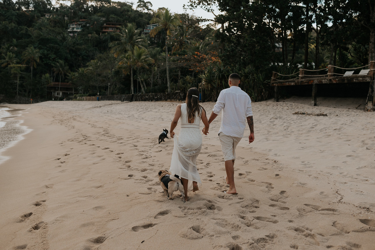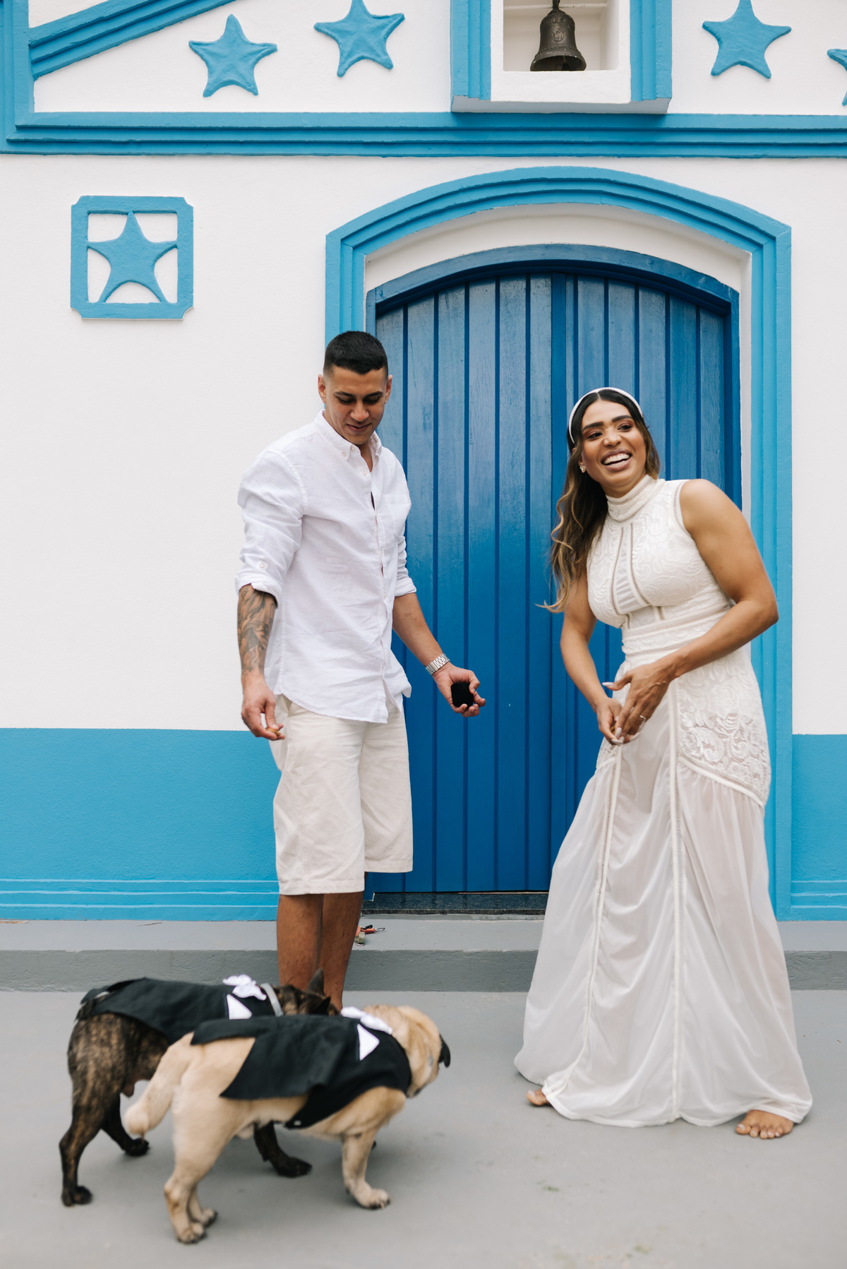 com eles estavam dois convidados especiais o seus cachorros para levar a aliança e serem testemunhas desse casamento na praia,