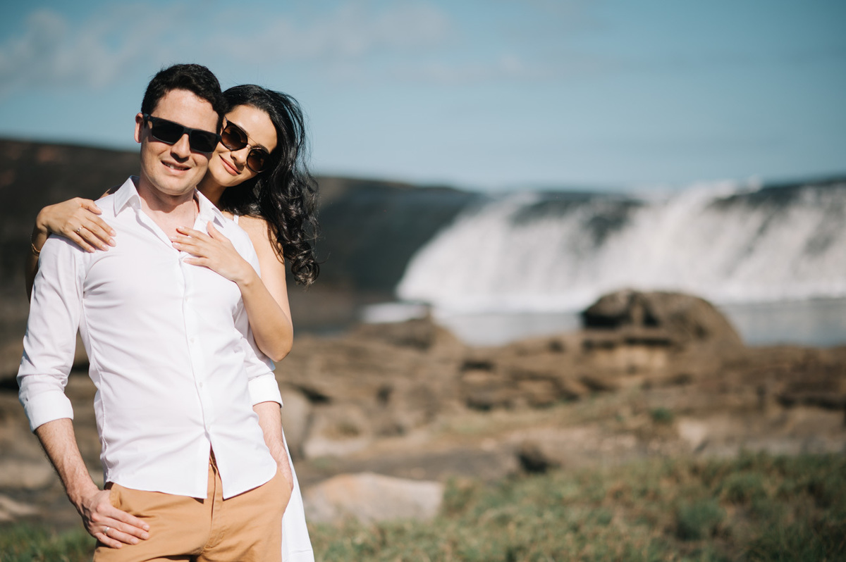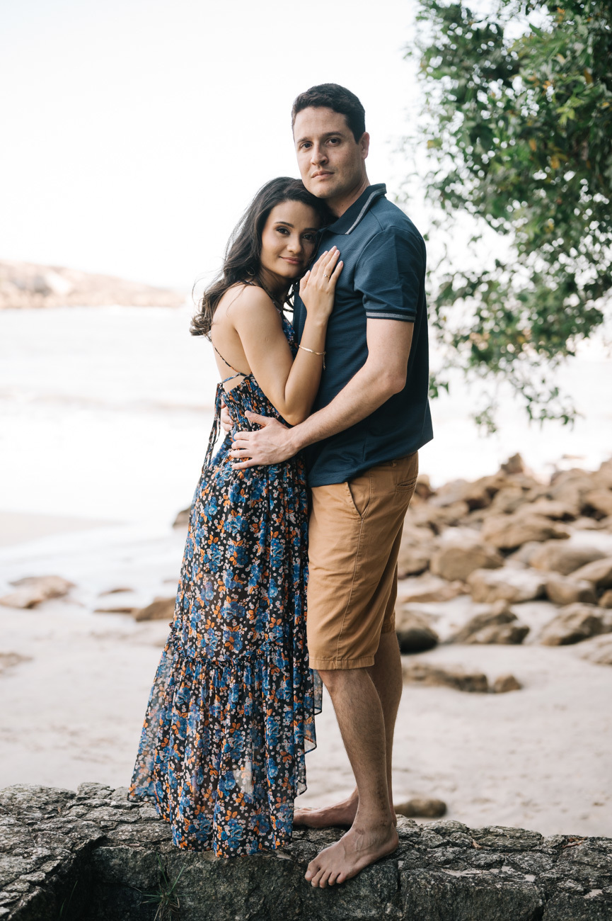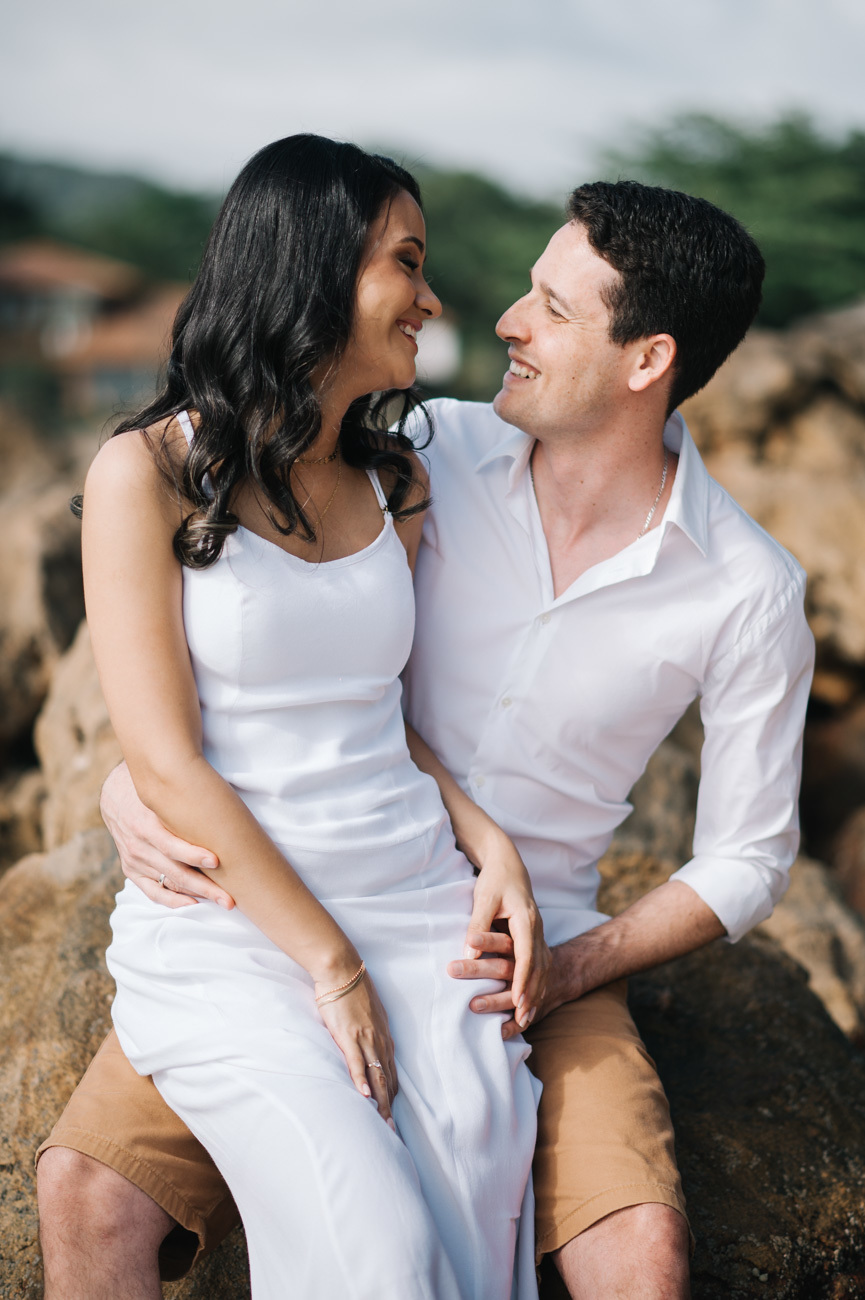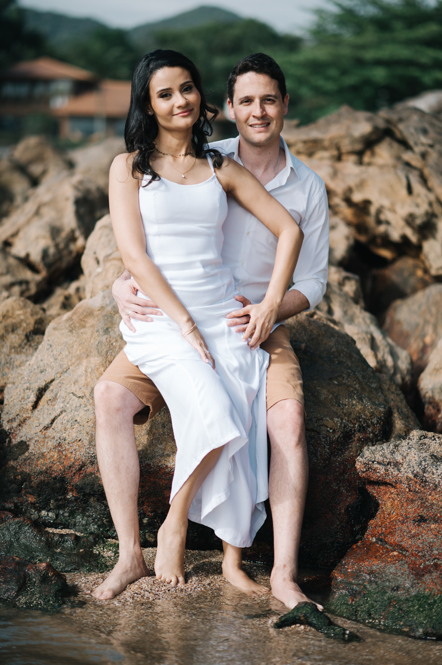 No início do ensaio, como sempre, o casal estava um pouco tímido. Mas, aos poucos, foram se soltando e deixando a ansiedade de lado. Aproveitamos cada detalhe do local: as rochas que parecem esculpidas à mão, o mar cristalino e a vegetação nativa. A luz do fim de tarde foi nossa maior aliada, proporcionando aquele tom dourado que deixa tudo mais mágico.