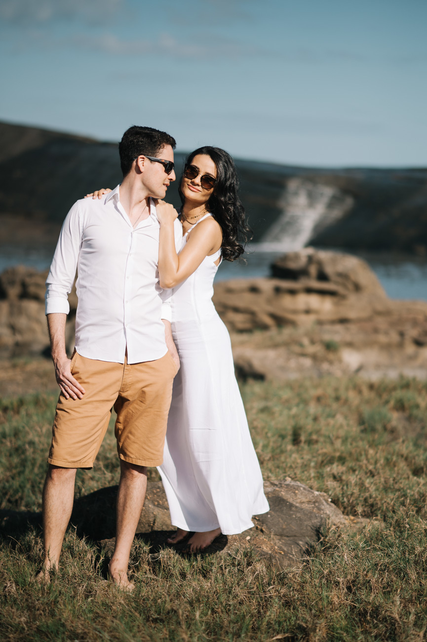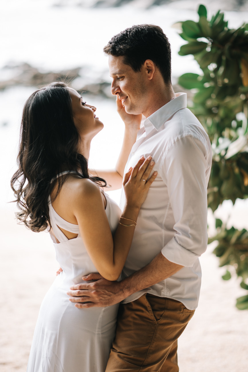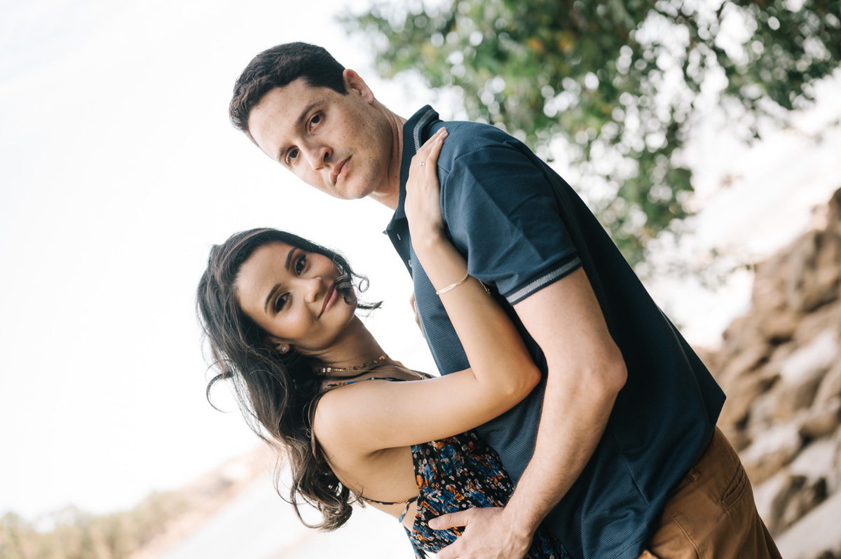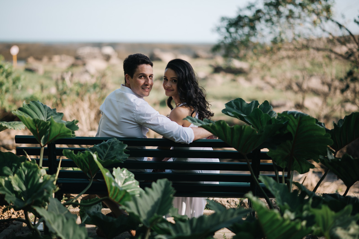 No início do ensaio, como sempre, o casal estava um pouco tímido. Mas, aos poucos, foram se soltando e deixando a ansiedade de lado. Aproveitamos cada detalhe do local: as rochas que parecem esculpidas à mão, o mar cristalino e a vegetação nativa. A luz do fim de tarde foi nossa maior aliada, proporcionando aquele tom dourado que deixa tudo mais mágico.