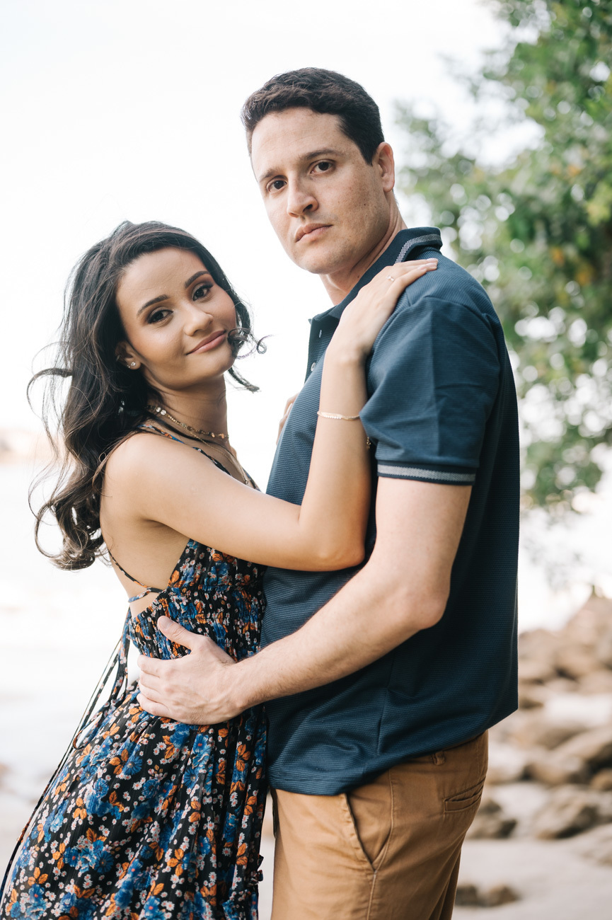 A Praia das Conchas é um tesouro escondido no litoral paulista. Com seu mar azul-turquesa, pedras imponentes e uma faixa de areia quase intocada, ela se tornou o cenário perfeito para registrar momentos de conexão, amor e cumplicidade entre o casal. A natureza exuberante ao redor, junto ao som das ondas quebrando suavemente, cria uma atmosfera super romântica e descontraída.