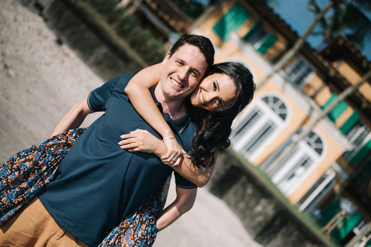 Um dos momentos mais marcantes foi, sem dúvida, o pôr do sol. Na Praia das Conchas, ele se revela de uma forma mágica, tingindo o céu com tons alaranjados e rosados. Enquanto o sol se despedia no horizonte, o casal se abraçava, e o clima de romance tomou conta. Foi o encerramento perfeito para um ensaio tão especial.