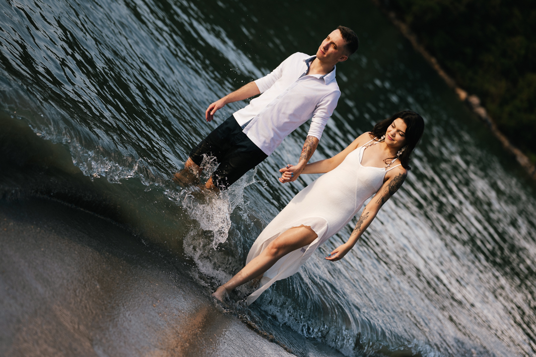 A Praia do Guaecá é uma das escolhas ideais para quem busca um ensaio pré-wedding de destino, com mar aberto, montanhas ao fundo e visual limpo. Fotografar cedo garante privacidade e segurança, algo essencial para casais que viajam até São Sebastião especialmente para viver essa experiência.