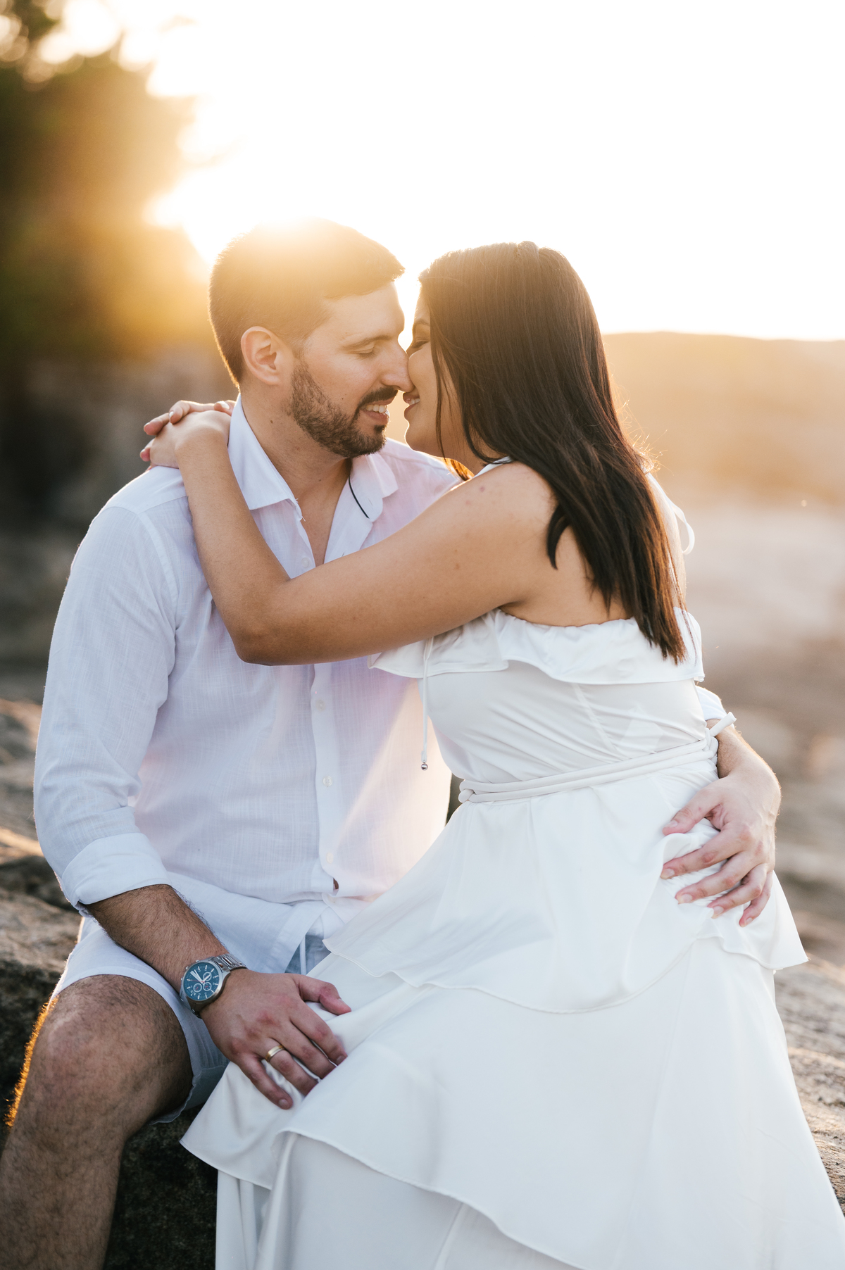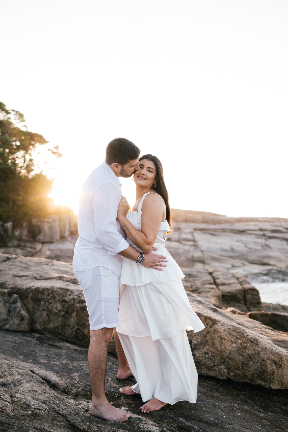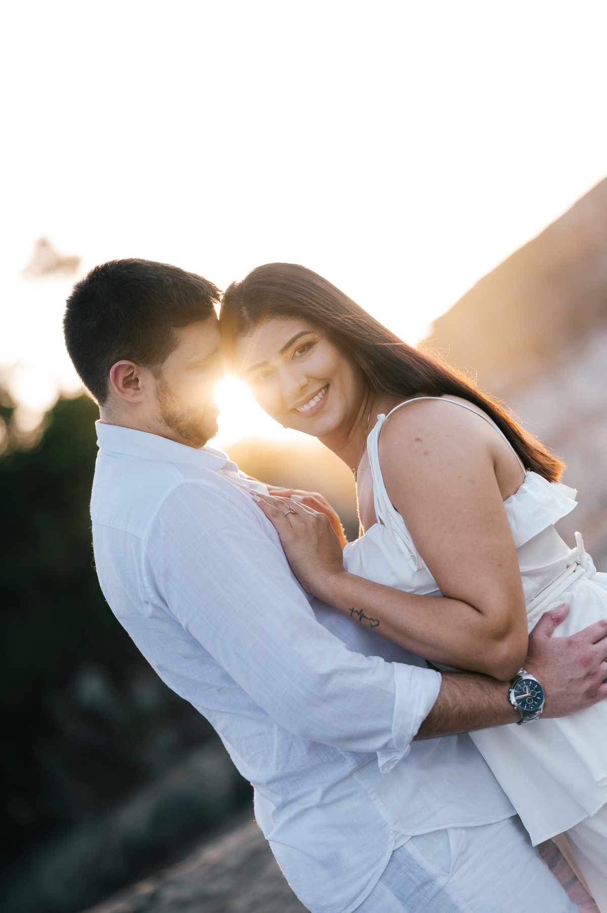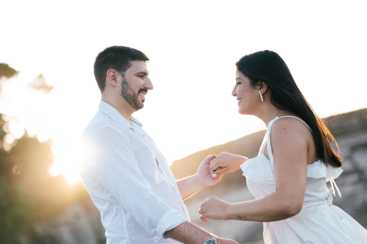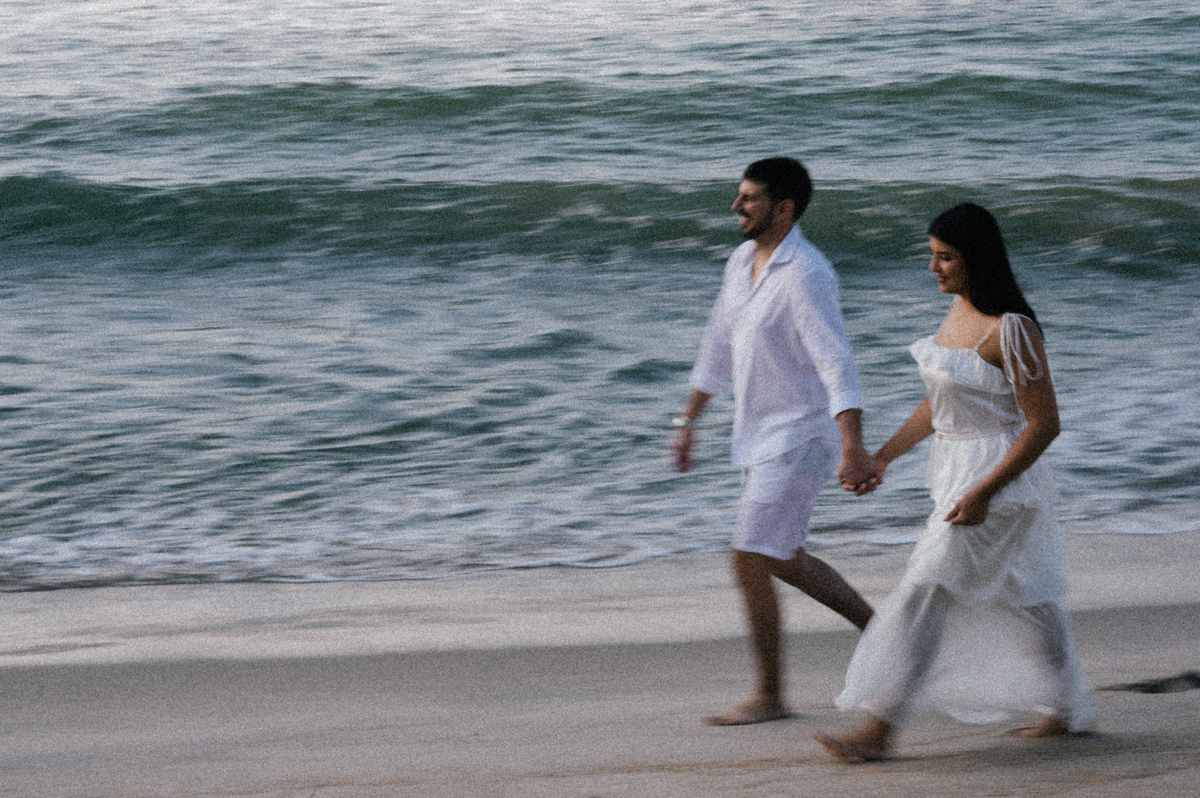 Iniciamos o ensaio às 5:30 da manhã, quando a praia ainda está silenciosa e praticamente vazia. Aos poucos, o sol surge por trás da serra, criando uma luz suave e dourada, perfeita para um pré-wedding na praia com estética leve e atemporal. Finalizamos às 7:00, aproveitando o melhor momento de luz natural do dia.