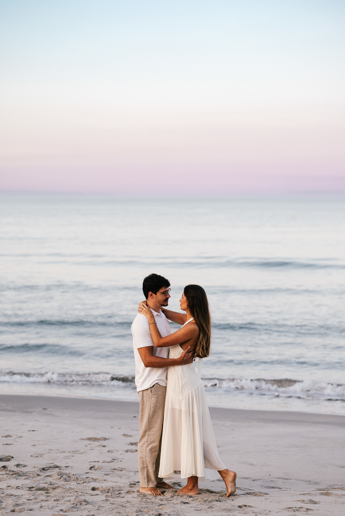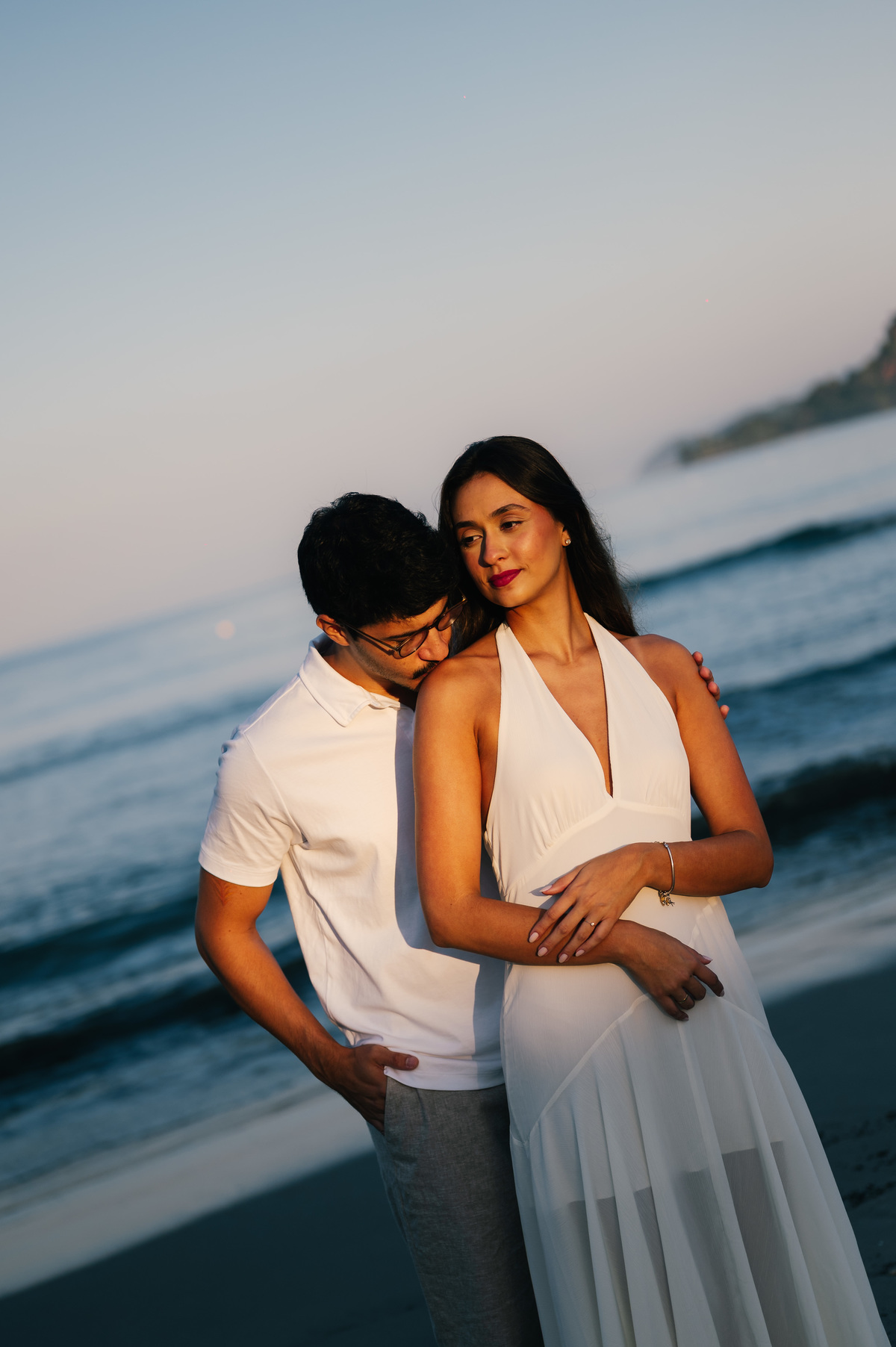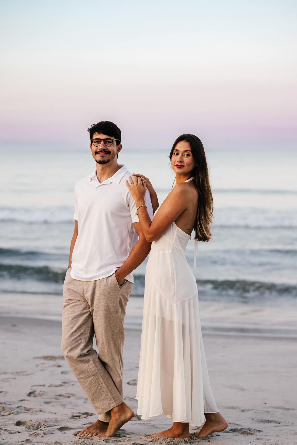 Diferente do pôr do sol, nesse dia o sol nasceu atrás da praia, criando uma luz suave no horizonte, perfeita para um ensaio pré wedding mais leve, natural e elegante.
