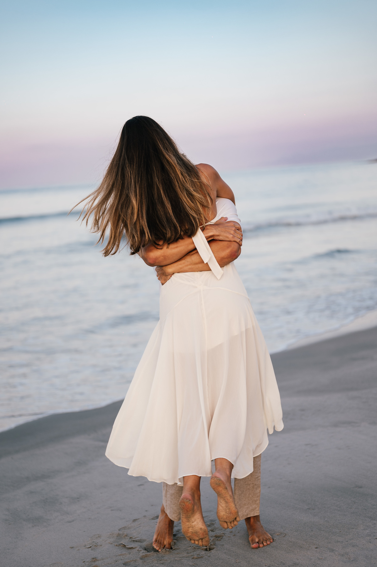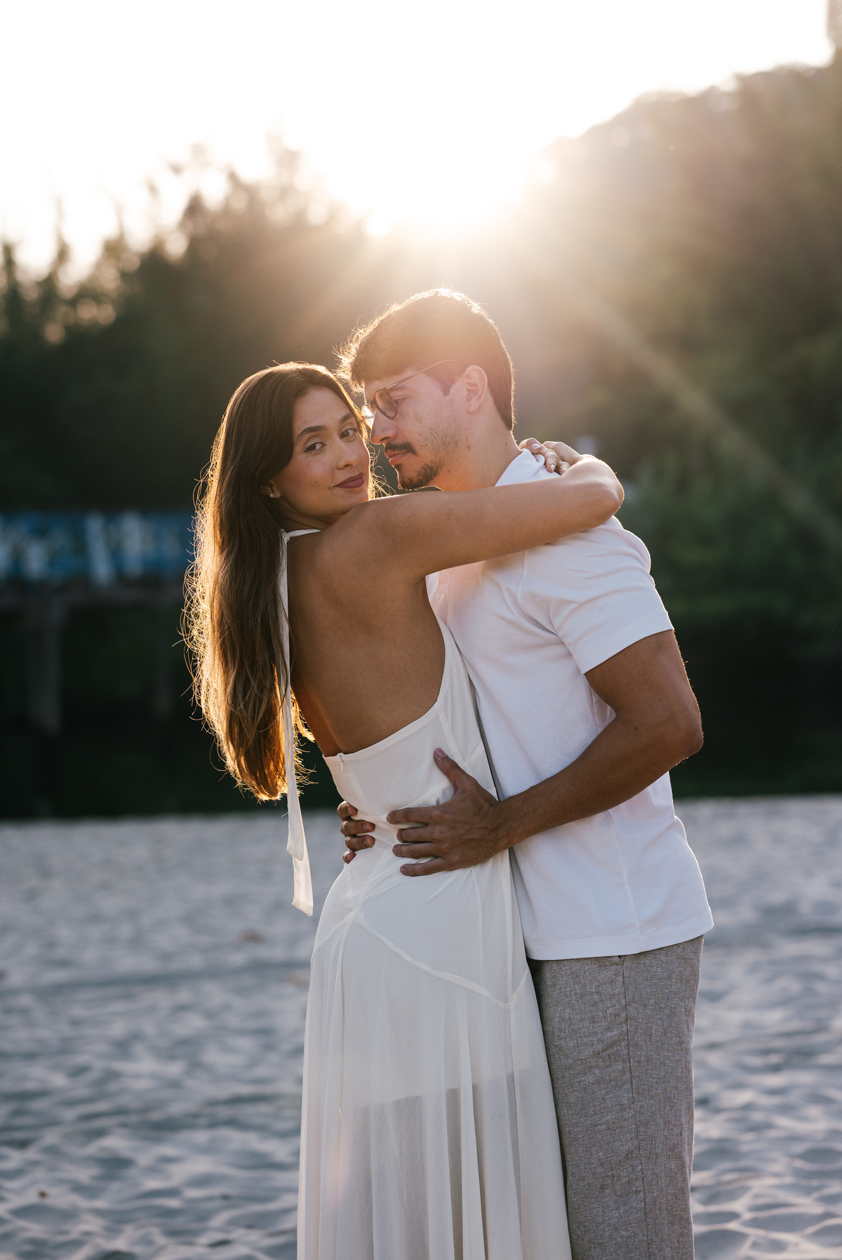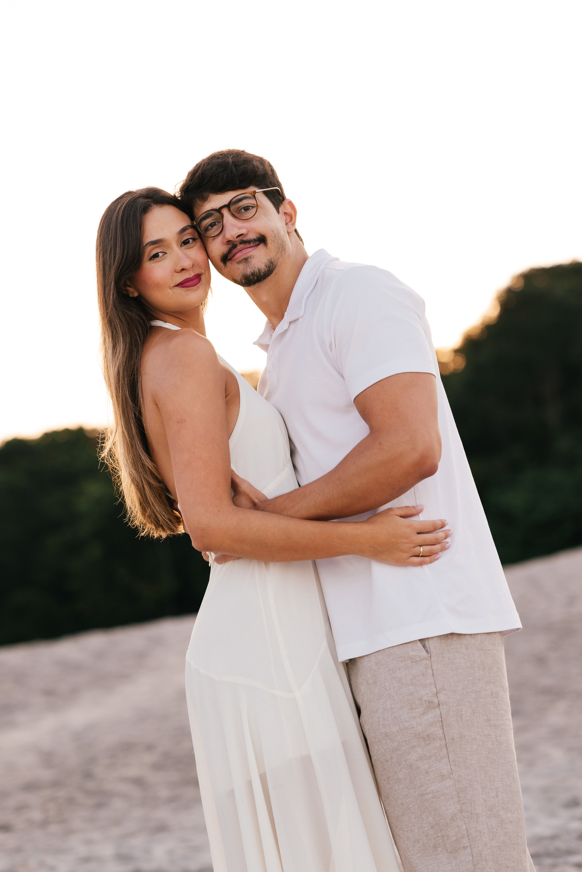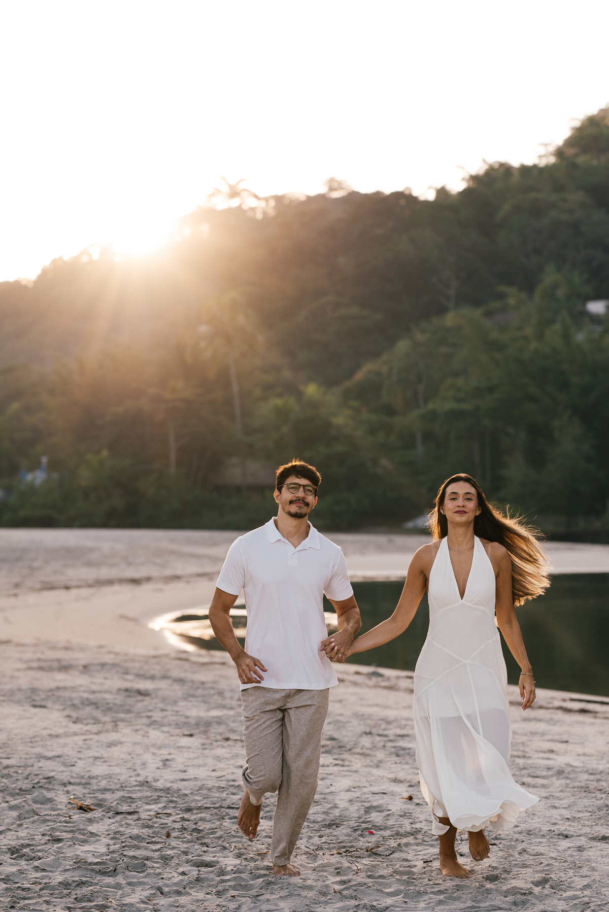 Diferente do pôr do sol, nesse dia o sol nasceu atrás da praia, criando uma luz suave no horizonte, perfeita para um ensaio pré wedding mais leve, natural e elegante.